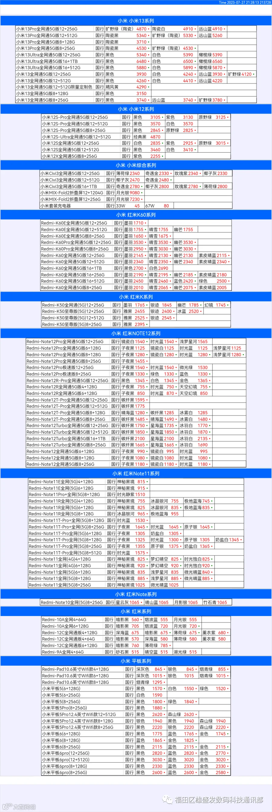 新机报价【2023年7月27日】小米  红米   黑鲨   报价 芯烨微 电子科技
