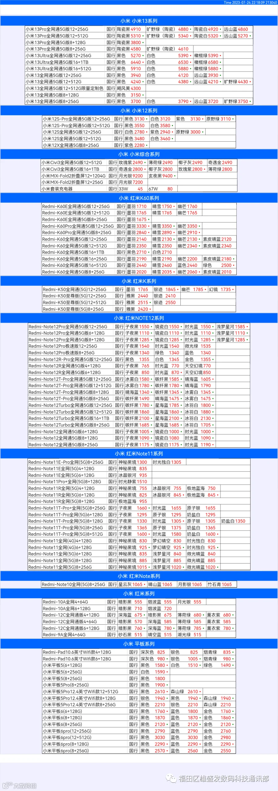 新机报价【2023年7月24日】小米  红米   黑鲨   报价 芯烨微 电子科技