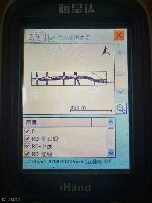 野外连接上RTK后打开测绘界面就会发现,移动轨迹实时显示预设底图上。此时,通过DXF底图的显示,测量人员能做到精确定位,重点测量。相反,如果没有DXF底图,测量人员在不熟悉测量地形,且事先不知道道路准确走向的前提下,通常采用盲测的方式容易偏离测量区域,或分不清测量重点。有了底图的指向,外业测量大大节省了工作量,而且实时提供位置信息。