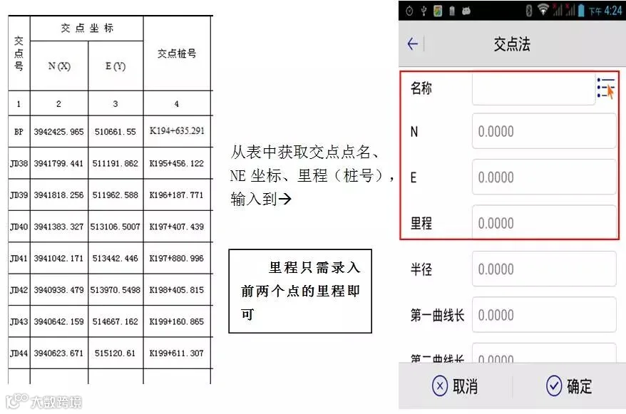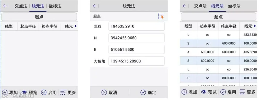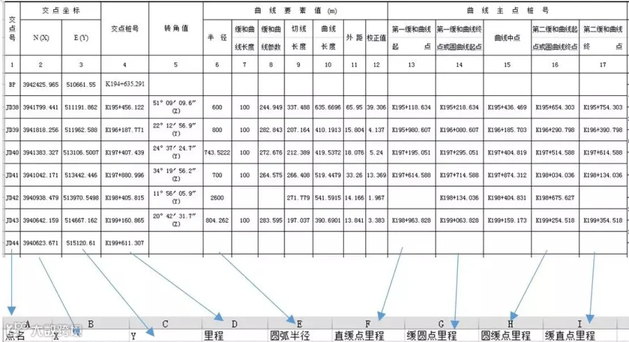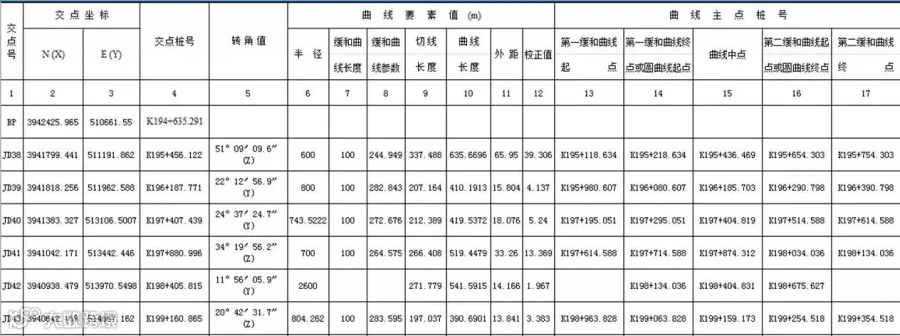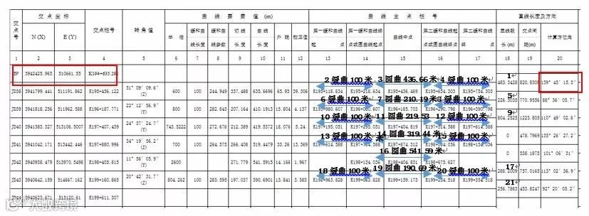 从表中获取起点里程、NE坐标、起点方位角(红框) 输入到起点信息中,然后按照从上到下,从左到右的顺序依次添加各段线元(如序号1-21所示)
