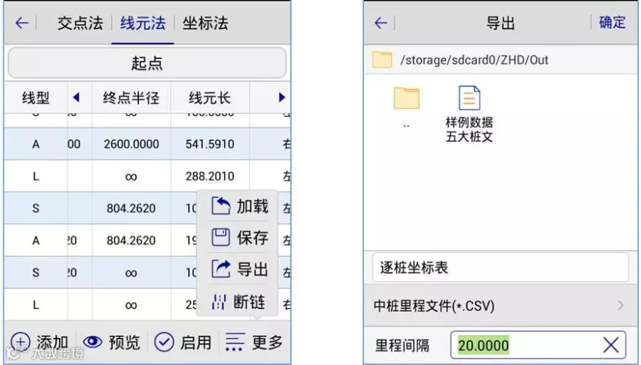 道路设计和检核无误后,使用更多 → 导出可以将道路线元数据和逐桩坐标表进行导出保存。