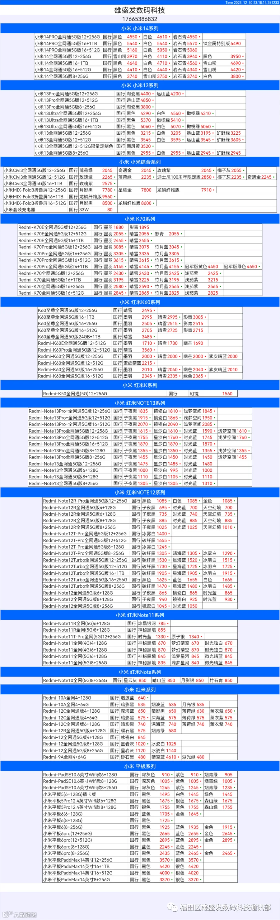 新机报价【2023年12月30日】小米  红米   黑鲨   报价 芯烨微 电子科技