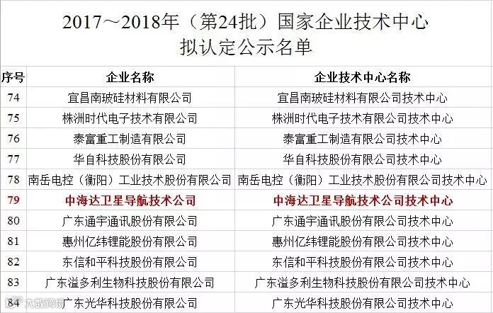 近日,国家发展改革委高技术产业司发布2017-2018年(第24批)国家企业技术中心拟认定名单公示,广州中海达卫星导航技术股份有限公司入选,序号为79。