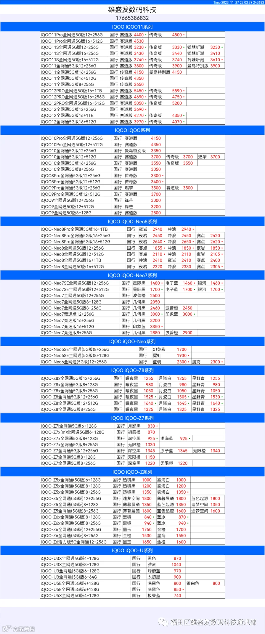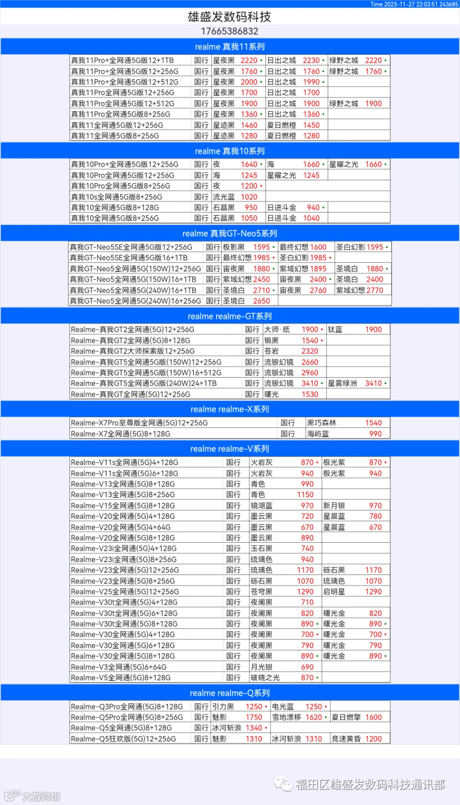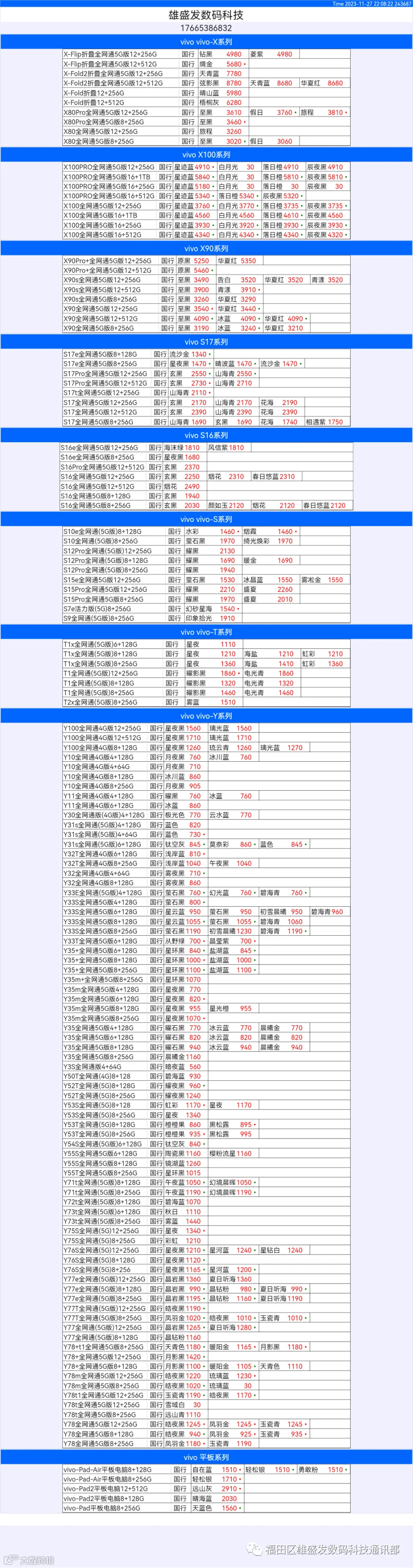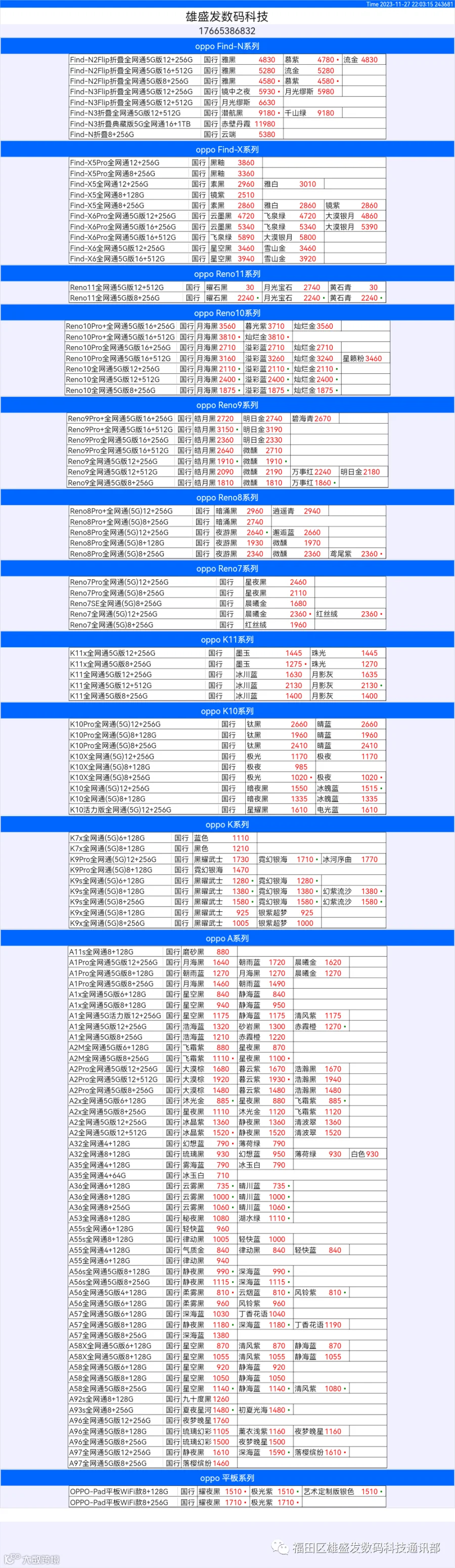 新机报价【2023年11月27日】OPPO   VIVO  IQOO   一加   真我 芯烨微 电子科技