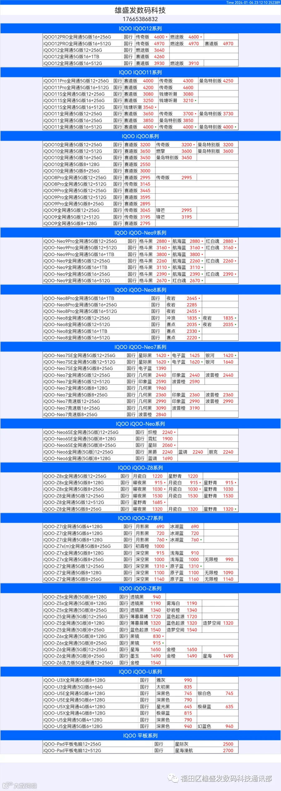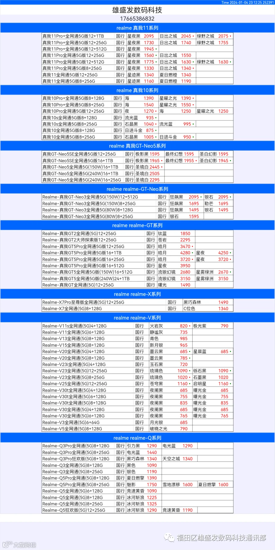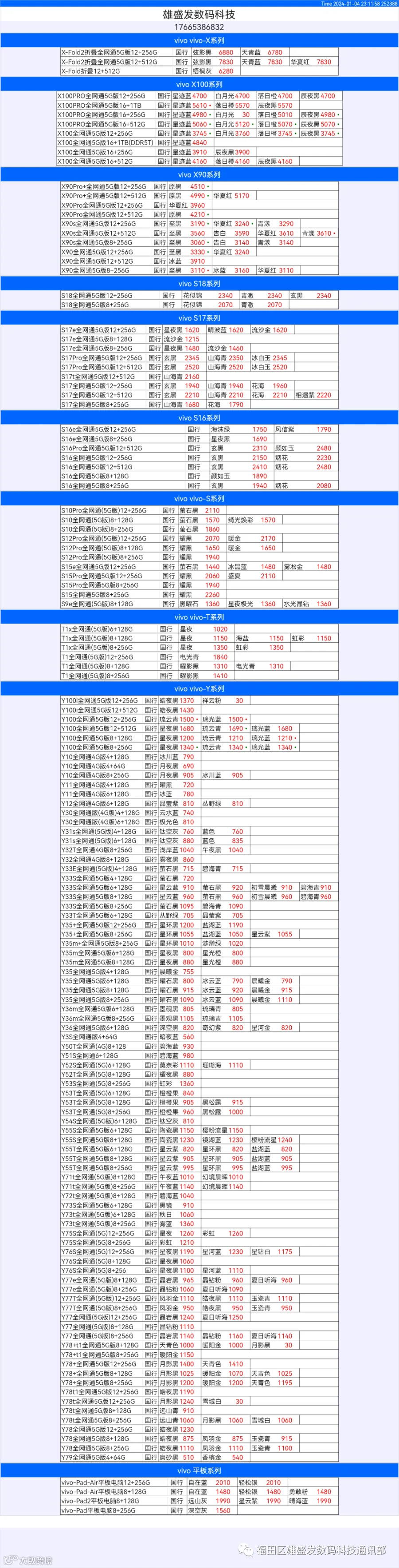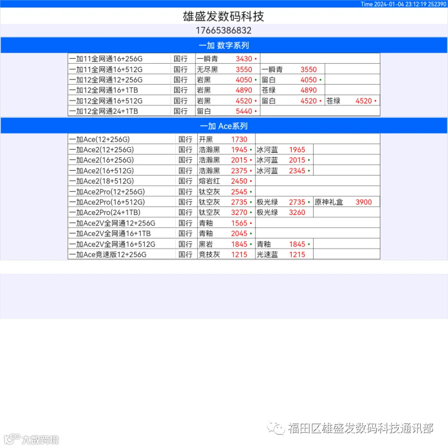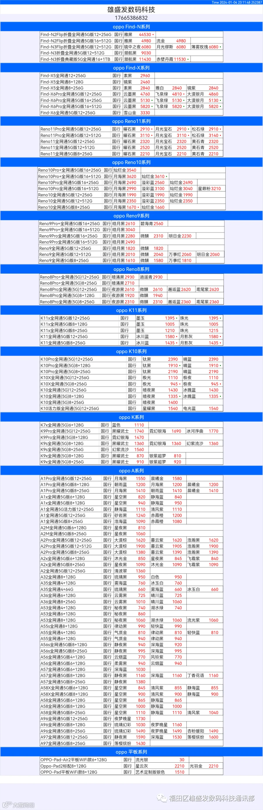 新机报价【2024年1月4日】OPPO   VIVO  IQOO   一加   真我 芯烨微 电子科技