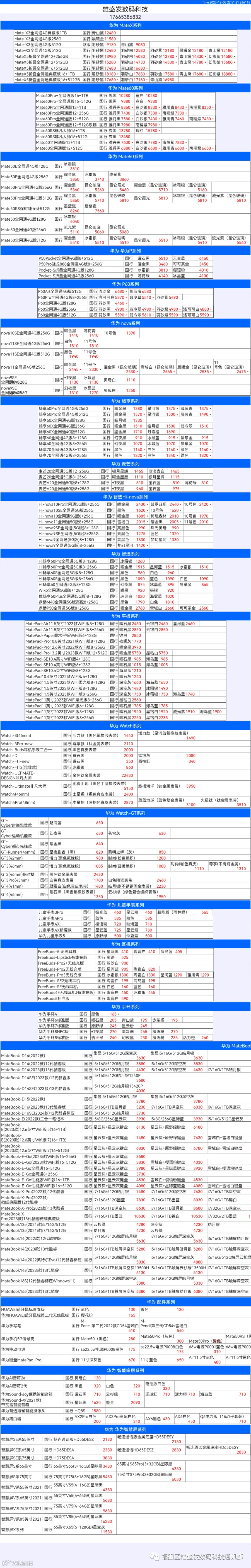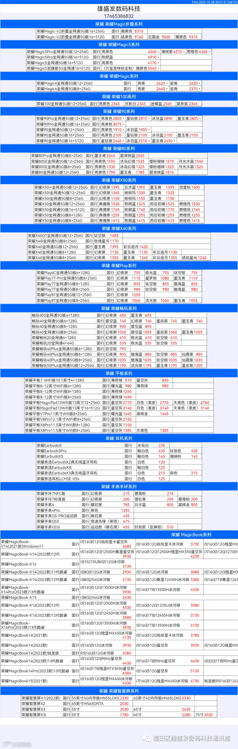 新机报价【2023年12月8日】华为   荣耀 报价 芯烨微 电子科技