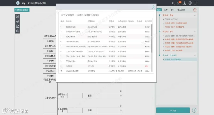 面向国土空间规划实施的各个环节建立监测评估预警探针,通过对业务系统的关键数据抽取,并结合相关法规规范等定制的评估预警模型生成预警结果专题,推送回业务实体,作为必要的审查内容。