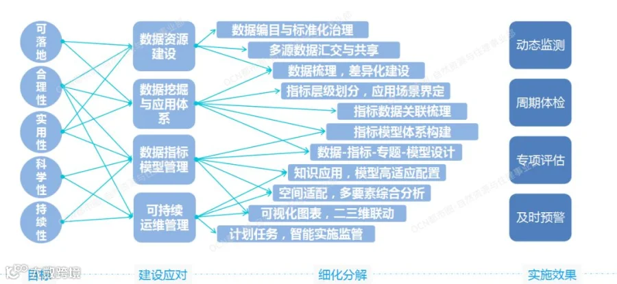 从安全、绿色、创新、开发、协调、宜居六大维度梳理指标,形成指标专题,并从行政层级传导、更新周期需求、数据来源三个维度进行分类梳理,通过模型把数据转换成指标,再落到国土空间治理的业务应用场景中,为国土空间实施决策提供依据。
