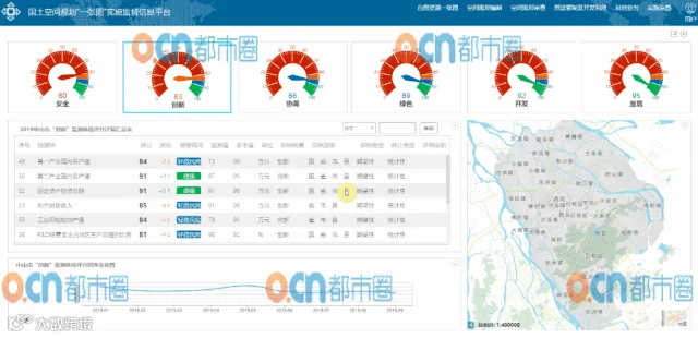 周期体检:结合国家监测指标要求,对安全、创新、协调、绿色、开放、宜居六个关键维度展开周期性的体检,基于单项指标的监测值结合空间化的目标值、参考值进行评分,并形成综合评分,支持图文联动与时序趋势的监测,实现对国土空间健康态势的智能化识别。
