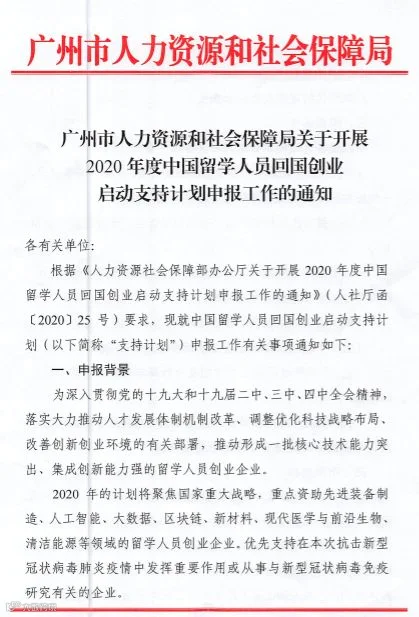 根据《人力资源社会保障部办公厅关于开展2020年度中国 留学人员回国创业启动支持计划申报工作的通知》(人社厅函〔2020〕25号)要求,现就中国留学人员回国创业启动支持计划(以下简称“支持计划”)申报工作有关事项通知如下: