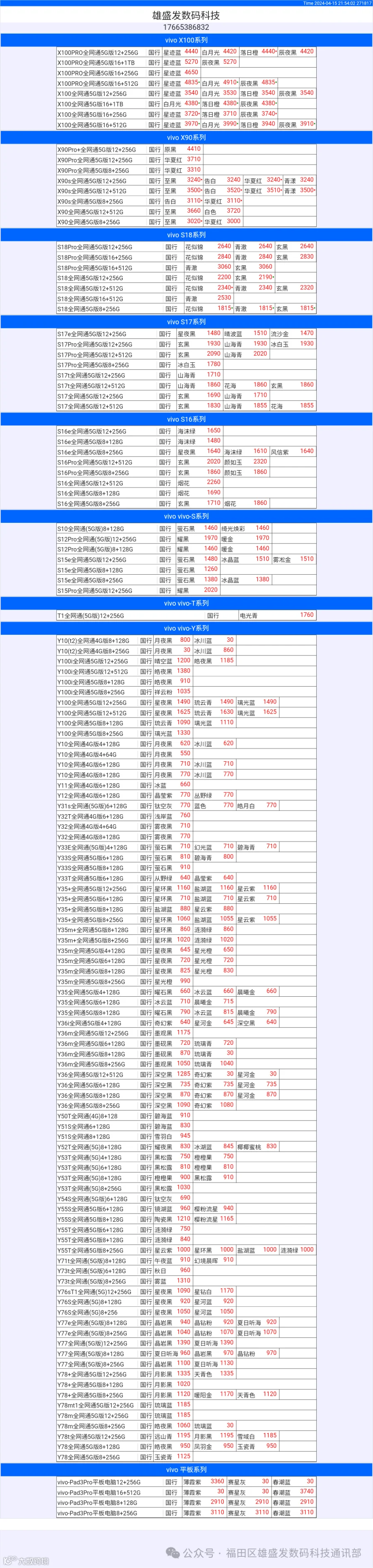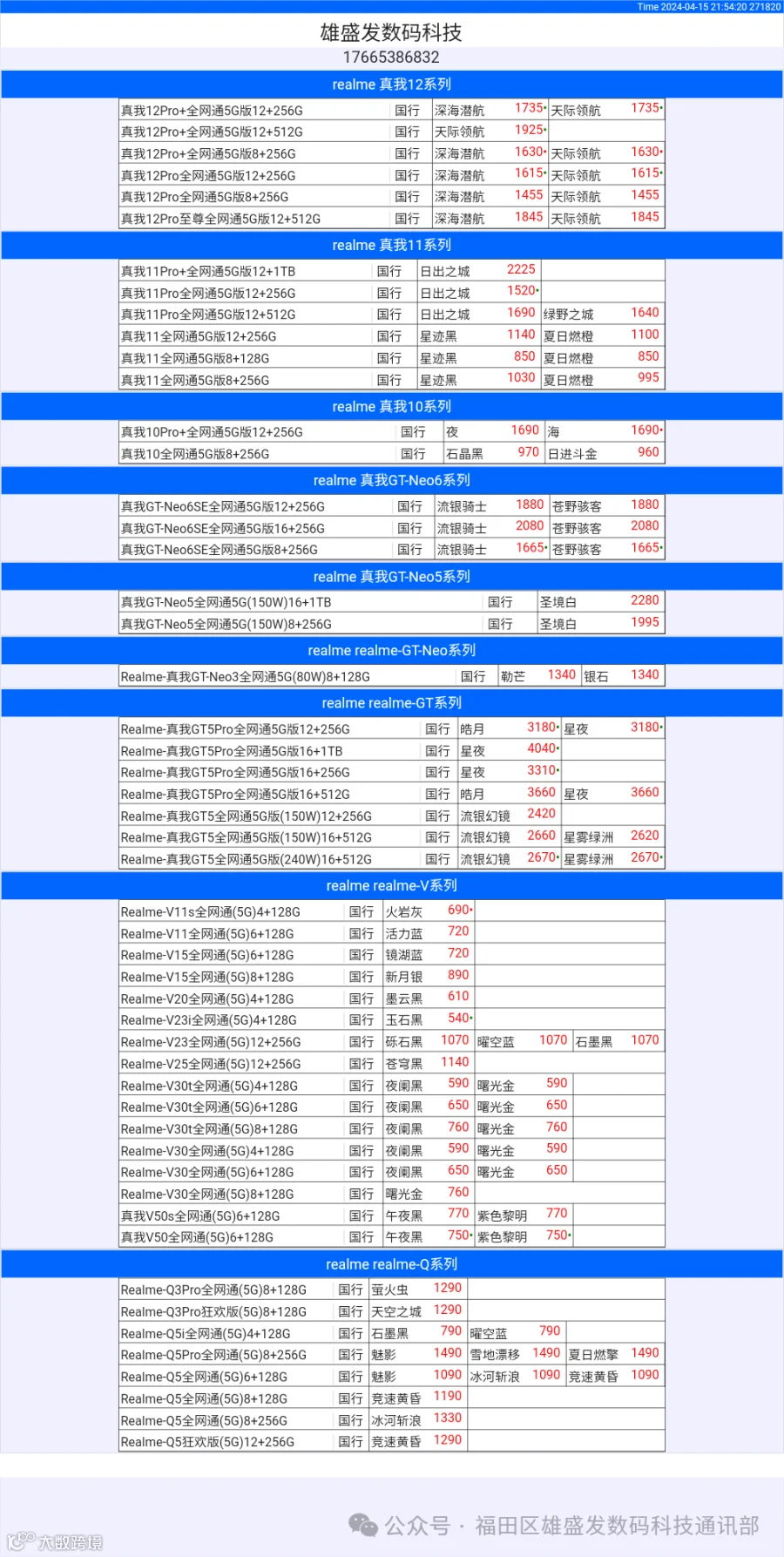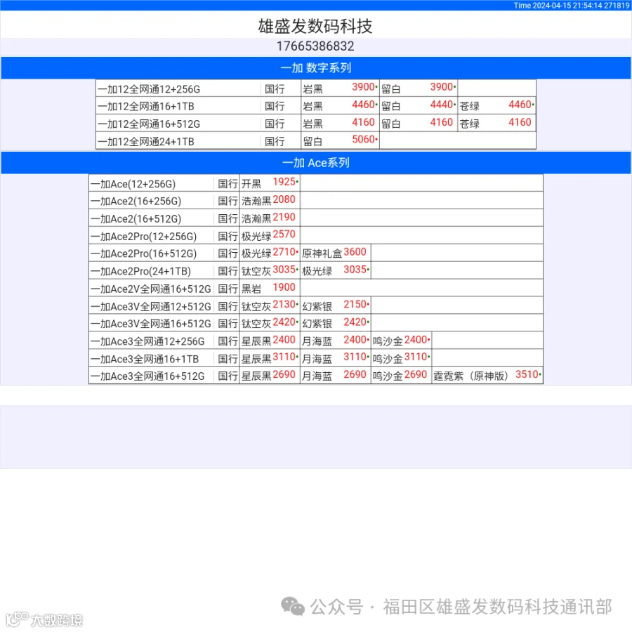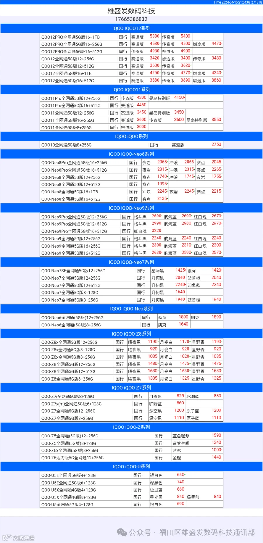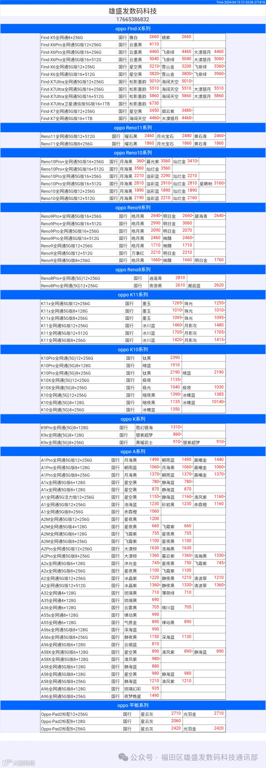 新机报价【2024年4月15日】OPPO   VIVO  IQOO   一加   真我 芯烨微 电子科技