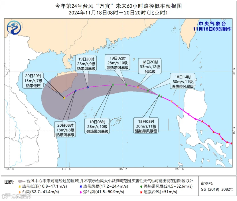 受冷空气和台风“万宜”的共同影响。预测,18-19日,台湾海峡、南海中北部海面、巴士海峡将出现东北风9~11级,阵风可达12级,其中台风“万宜”中心经过的海面风力更是将达到12~13级。同时,粤东海面也将面临东北风8~9级,阵风10级的挑战,广东中西部海面东北风将达到6~8级,阵风9级。20日,虽然风力略有减弱,但台湾海峡、南海北部海面仍将有东北风7~8级,阵风9级,广东省海面东北风6~7级。