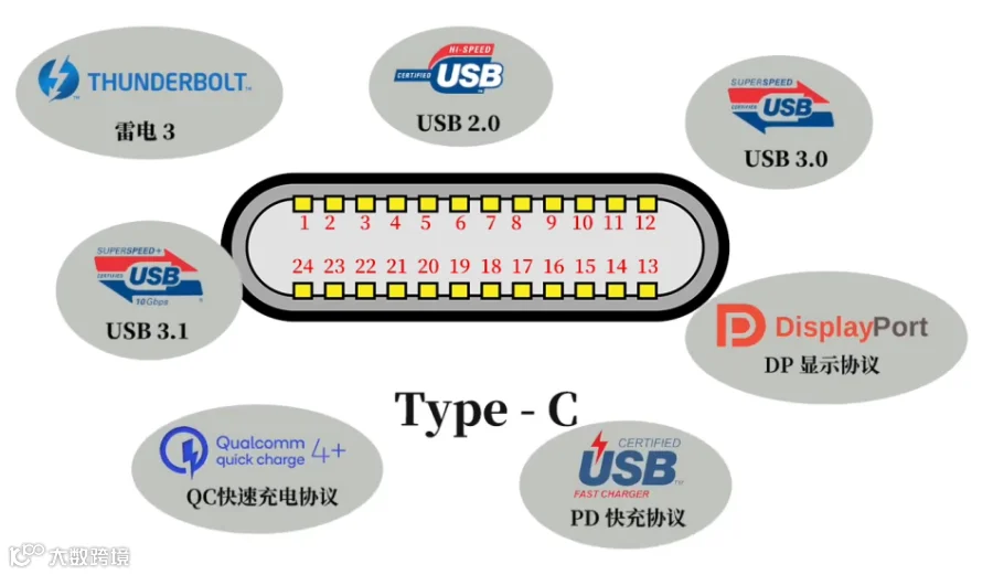 由于Type-C接口非常强,所以它支持多种协议,比如雷电3协议以及传统的USB2.0、USB3.0协议,还有用于快速充电的QC协议、PD协议,以及连接显示器用的HDMI协议、DP协议等,因此可以说Type-C是一种万能的接口。