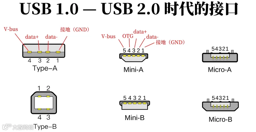 我们通常所说的USB2.0、USB3.0、雷电3、USB4等就是数据传输协议,它就像沟通用的语言,是我们看不见摸不着的东西。而各式各样的USB接口则是我们制造出来的真实存在的东西,由多根导线组成,用来导电作为数据传输的载体。在USB1.0 — USB2.0 时代,接口形状有很多。USB2.0协议速度还是比较慢的,当时的USB接口都是4根线的,最外面的两根负责给鼠标、键盘、手机之类的东西供电,中间两根负责传输数据。其中我们最常见的是USB Type-A、Mini-B和Micro-B。