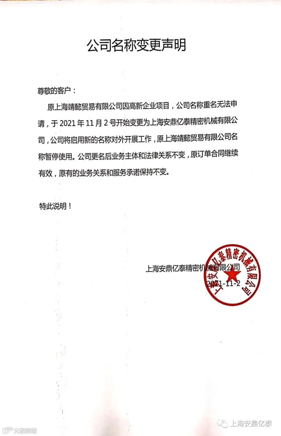 感谢大家一直以来对上海靖懿贸易有限公司的支持,这个名字与我们一起成长8年,在这8 年里见证了我们从0到几十家客户,在这8年里也见证我们成功与失败!感谢在这8年里一直陪伴我们的客户们,对我们的信任,我们会给您专业的服务!以下是变更名称的声明------上海安鼎亿泰精密机械有限公司。