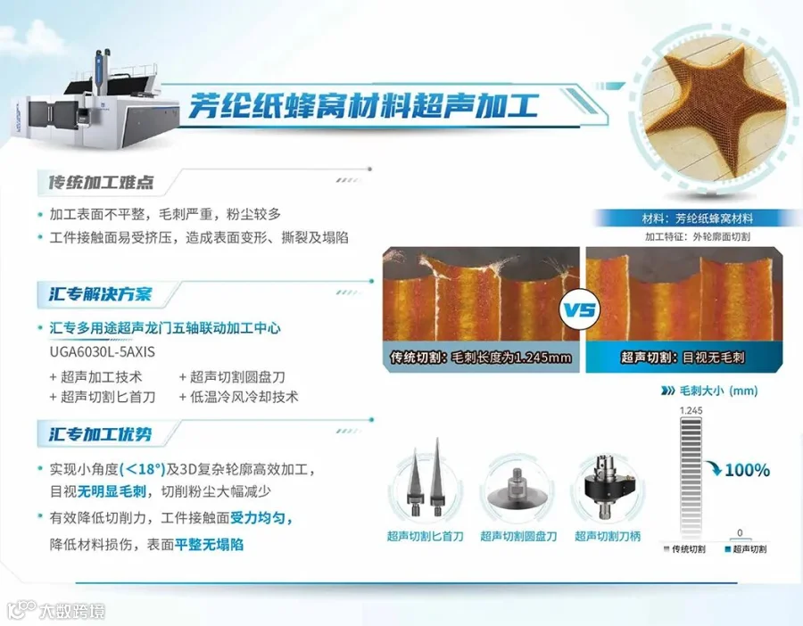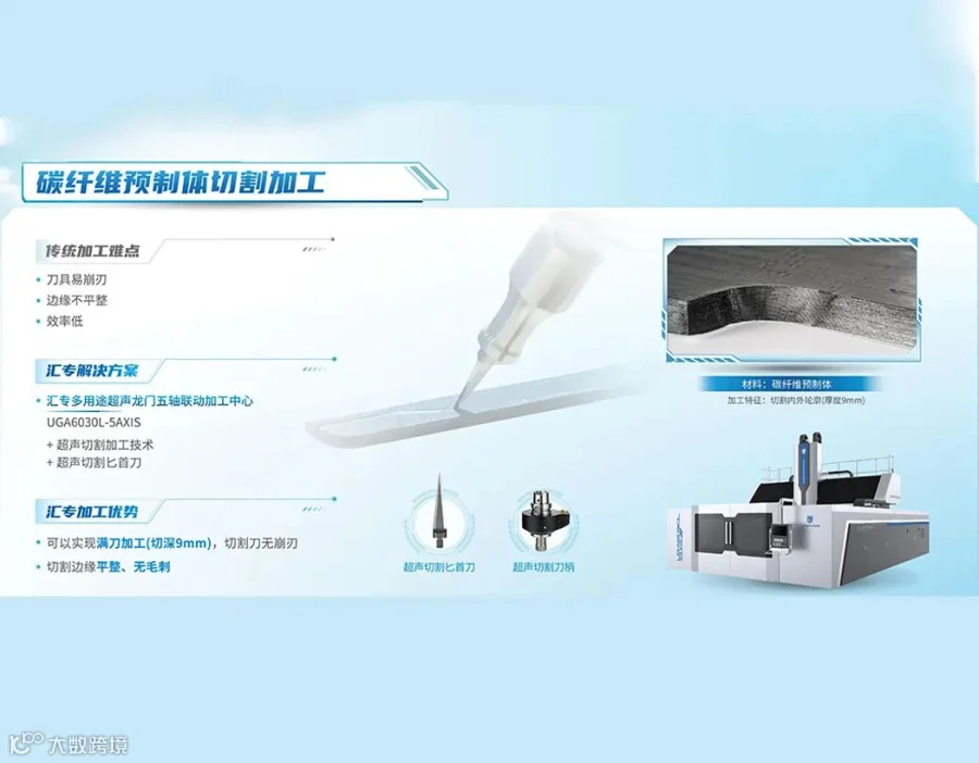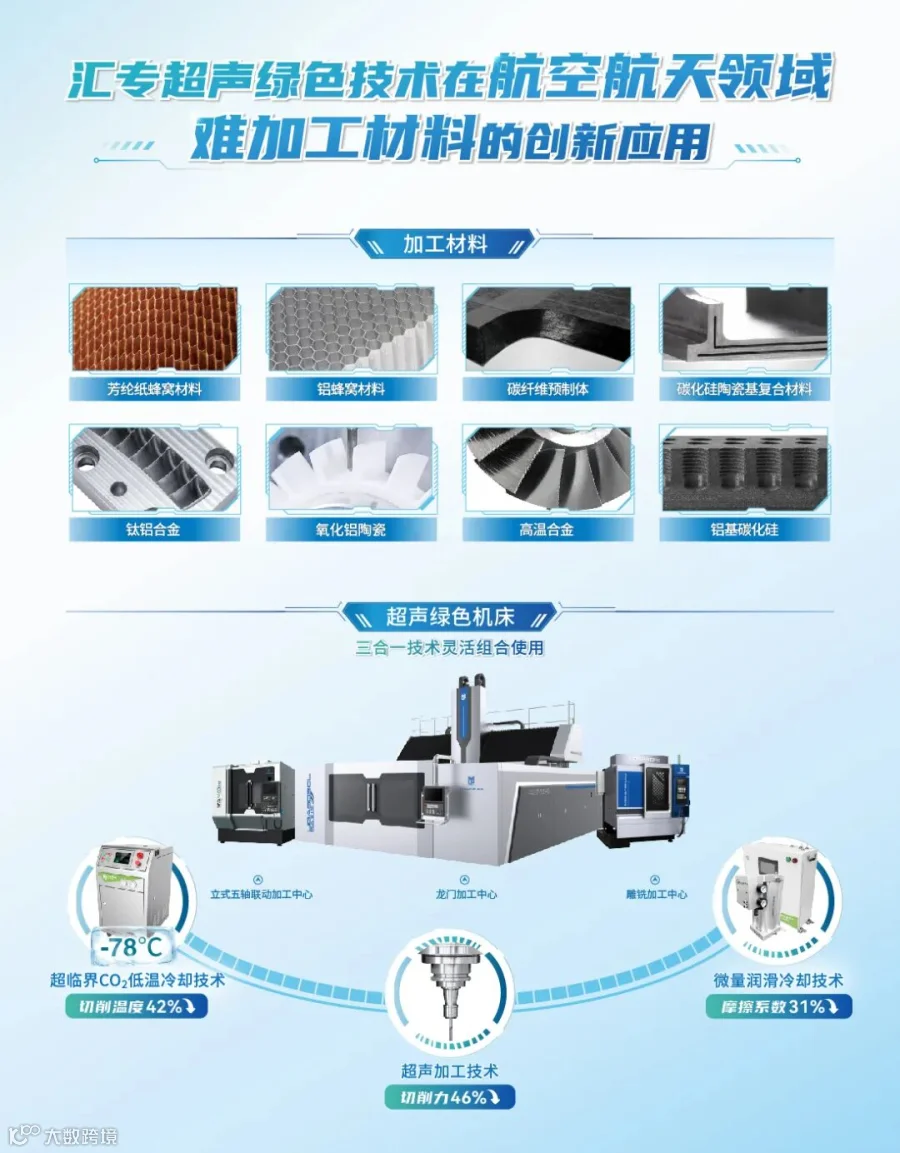 在业内,汇专还率先将超声技术、绿色技术与数控机床有机融合,打造出具有自主知识产权的超声绿色数控机床产品体系,为先进复合材料、硬脆材料、难加工金属材料提供了高质高效的加工解决方案,并在航空航天领域中得到了成功应用。