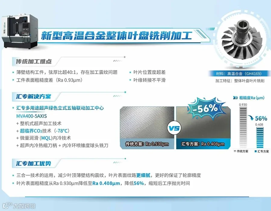 例如,加工芳纶纸蜂窝飞机复材特征提取综合测试件,解决了业内无法加工小于18°坡度蜂窝材料的难题,工件表面目视无毛刺;加工碳纤维预制体,实现满刀加工,切深达9mm,且切割边缘平整、无毛刺,并将加工时的发热温度控制在25°C以内,有效避免工件粘结、保证材料性能;加工新型高温合金整体叶盘时,超声技术、超临界CO₂低温冷却技术、微量润滑冷却技术的组合运用,减少叶顶薄壁结构震纹,更好地保证了叶片轮廓精度,叶片表面粗糙度达Ra0.408μm,比传统加工方案大幅降低56%,从而有效提升发动机效能。
