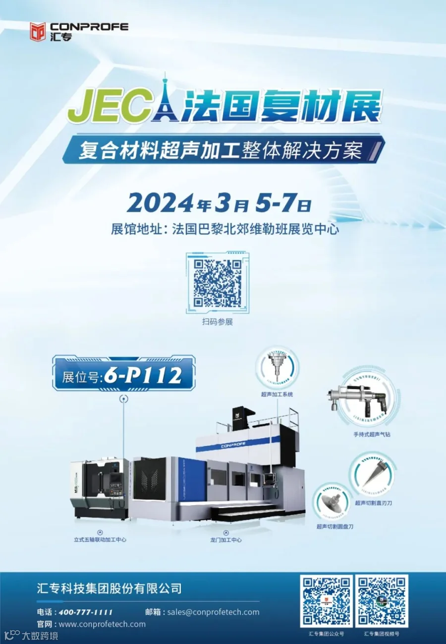 2024年3月5-7日,汇专将携超声绿色加工方案及产品前往法国巴黎,亮相世界领先的国际复合材料盛会——法国JEC国际复合材料展览会,我们期待与您在6号馆P112展位相聚!