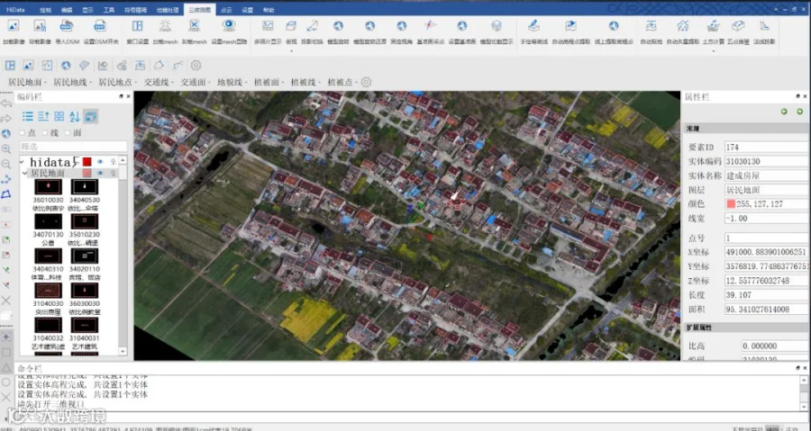 项目飞行原片数据在内业使用Context Capture软件进行空三加密与建模,使用HiData三维测图软件打开DOM与三维模型成果进行地籍图成图。
