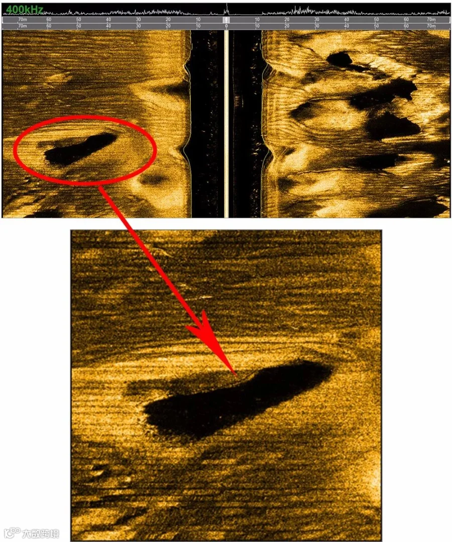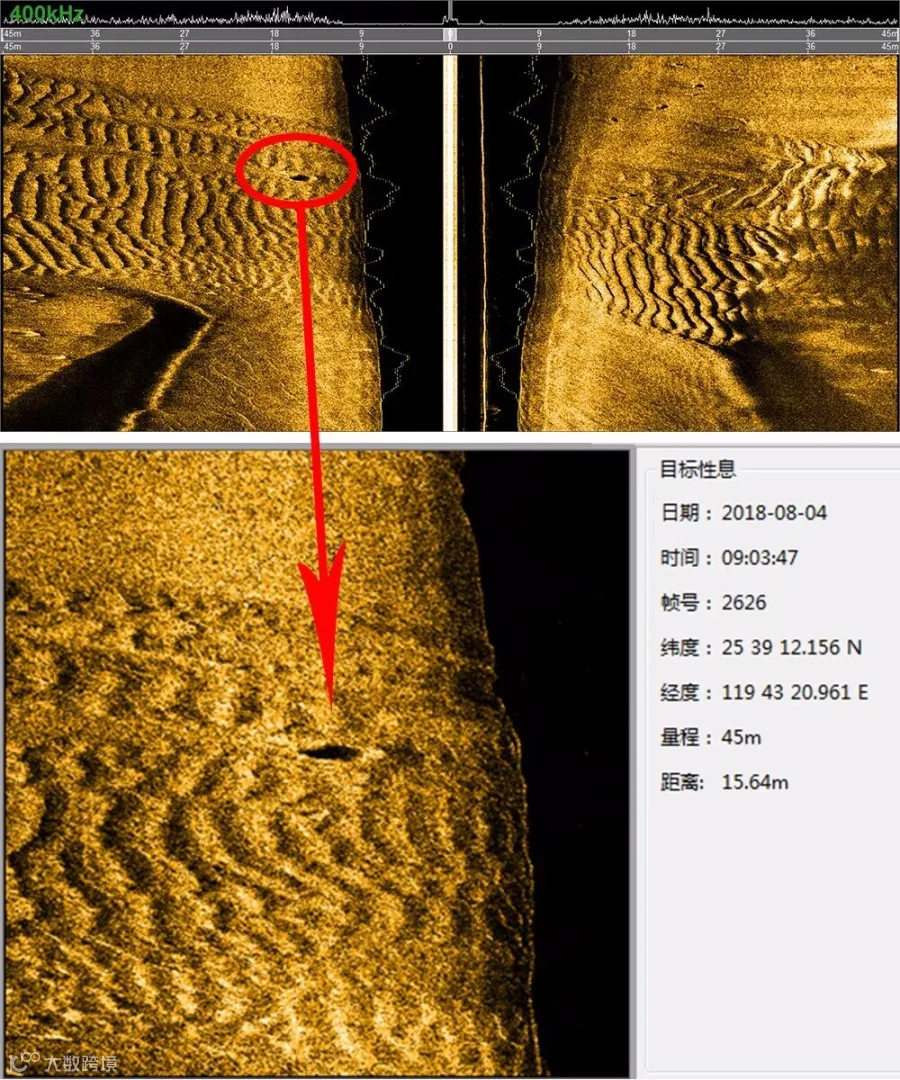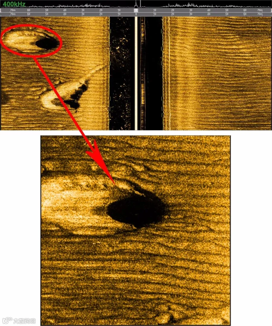本次扫测,还意外发现非法采砂的痕迹,黑色圆洞部分就是采砂船抽沙管道插入海底抽沙形成的深洞,旁边高亮部分是抽沙时沙层坍塌所留下的痕迹,如下图: