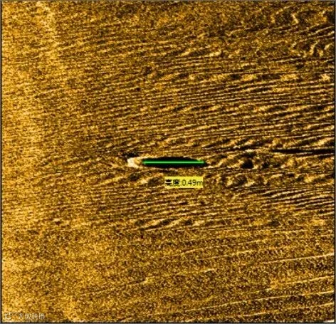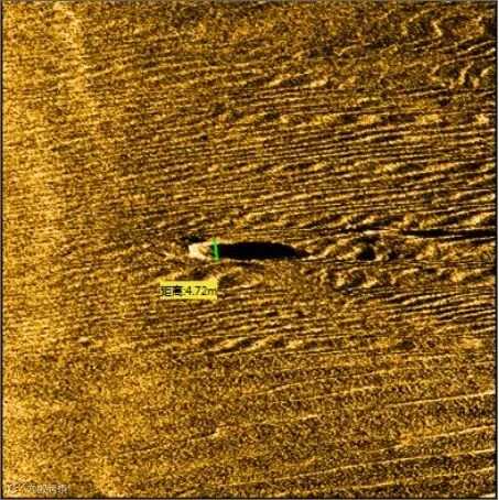 此次扫测中, iSide 4900侧扫声纳发现了很多海底石锚,如图5-8所示,亮金色部分为石锚强反射回波,石锚突出海底部分遮蔽了声波的传播,在后面形成长长的阴影,如图5、图6、图7: