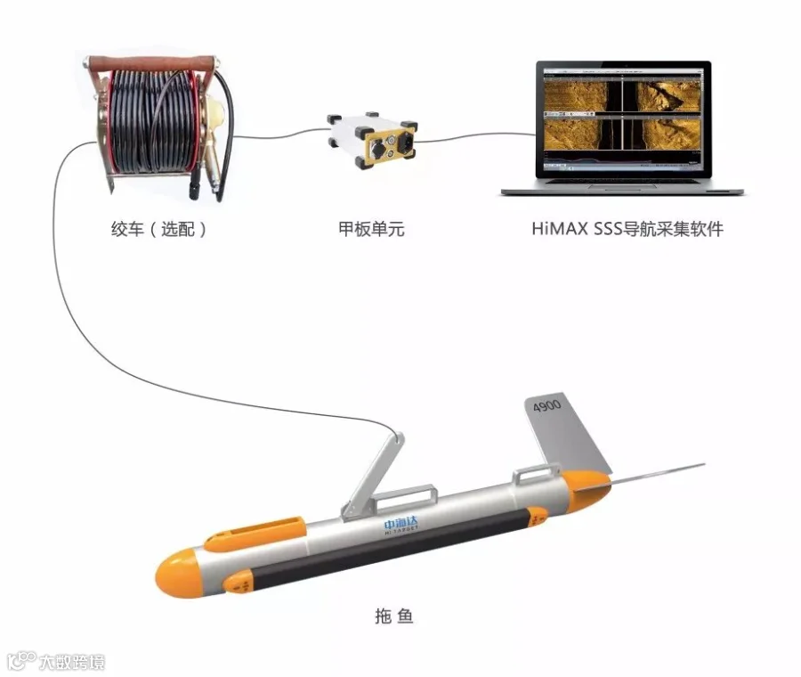 侧扫声纳iSide 4900安装非常简单,主要分为三个部分:甲板单元、拖缆及拖鱼。甲板单元可使用220V交流电,也可使用蓄电池供电;拖鱼安装主要涉及到平衡尾翼的安装、水密头线缆连接以及拖曳用缆绳连接(也可以使用拖缆直接拖曳拖鱼)。如图2: