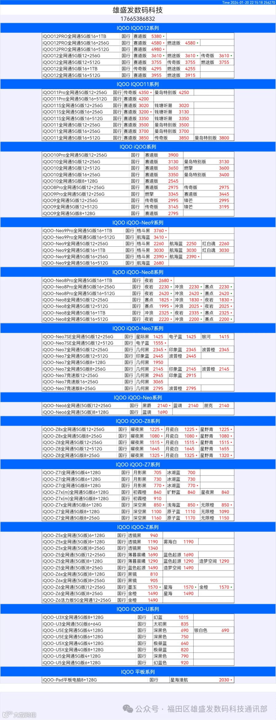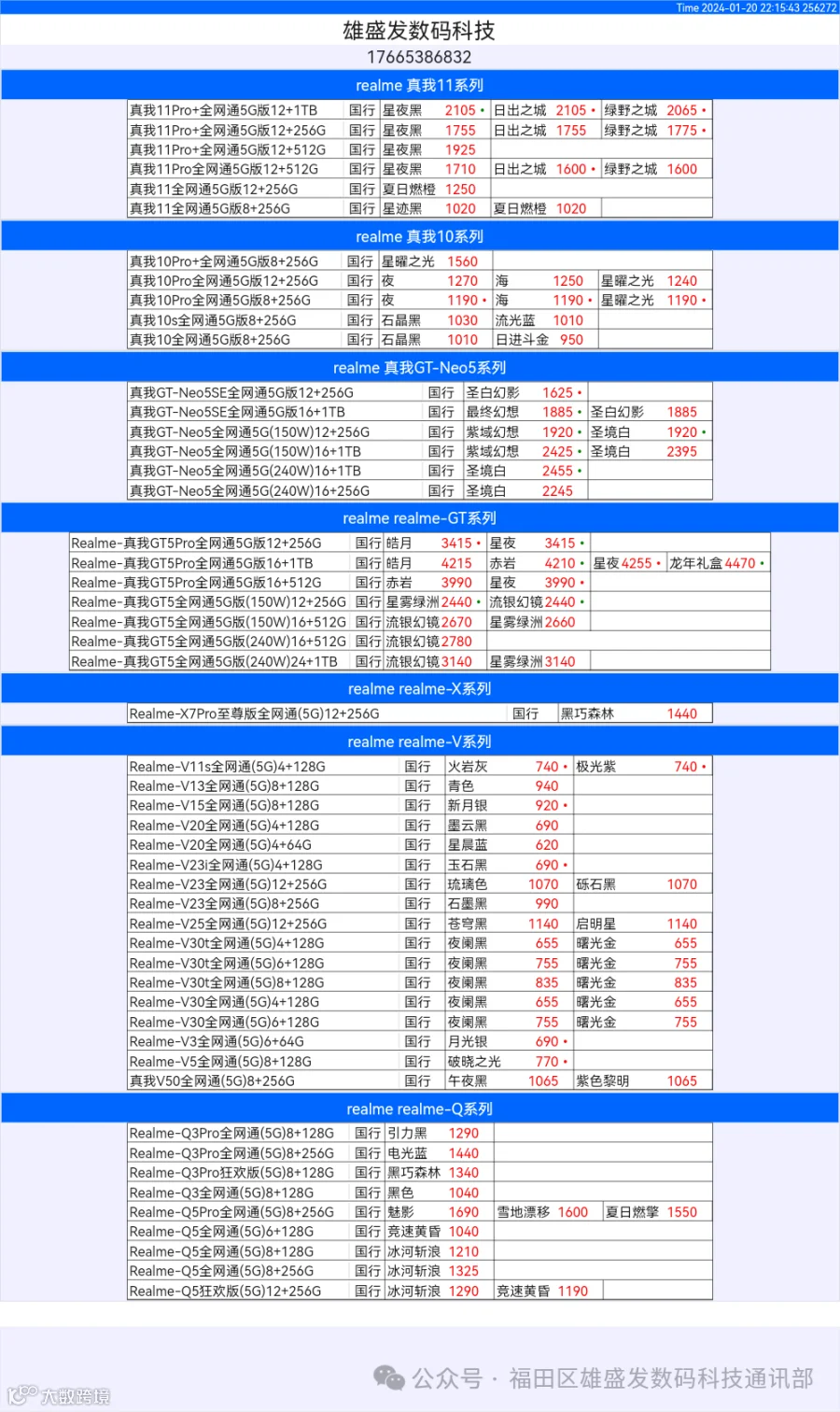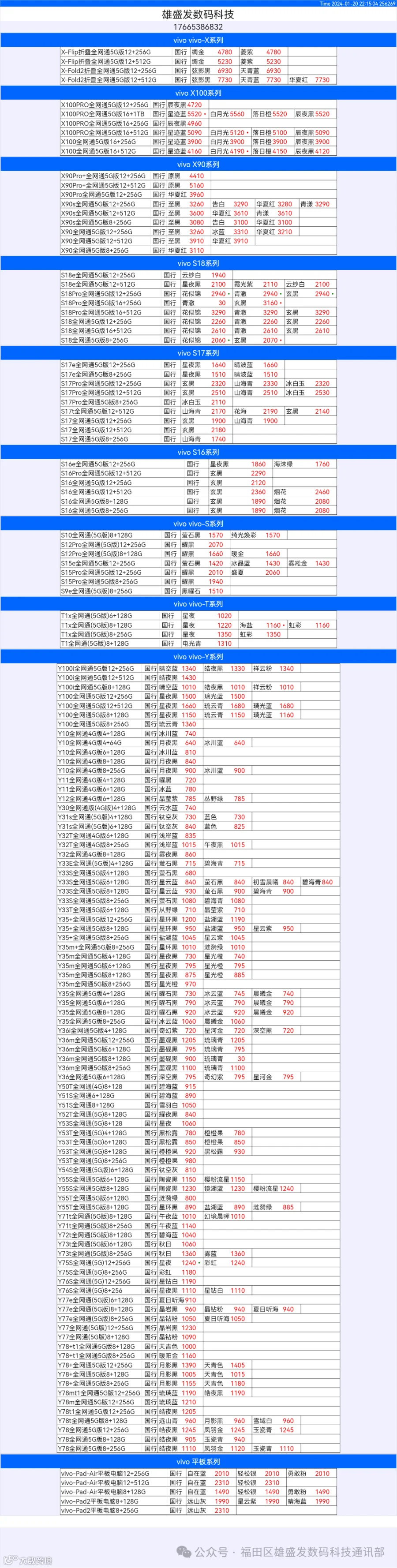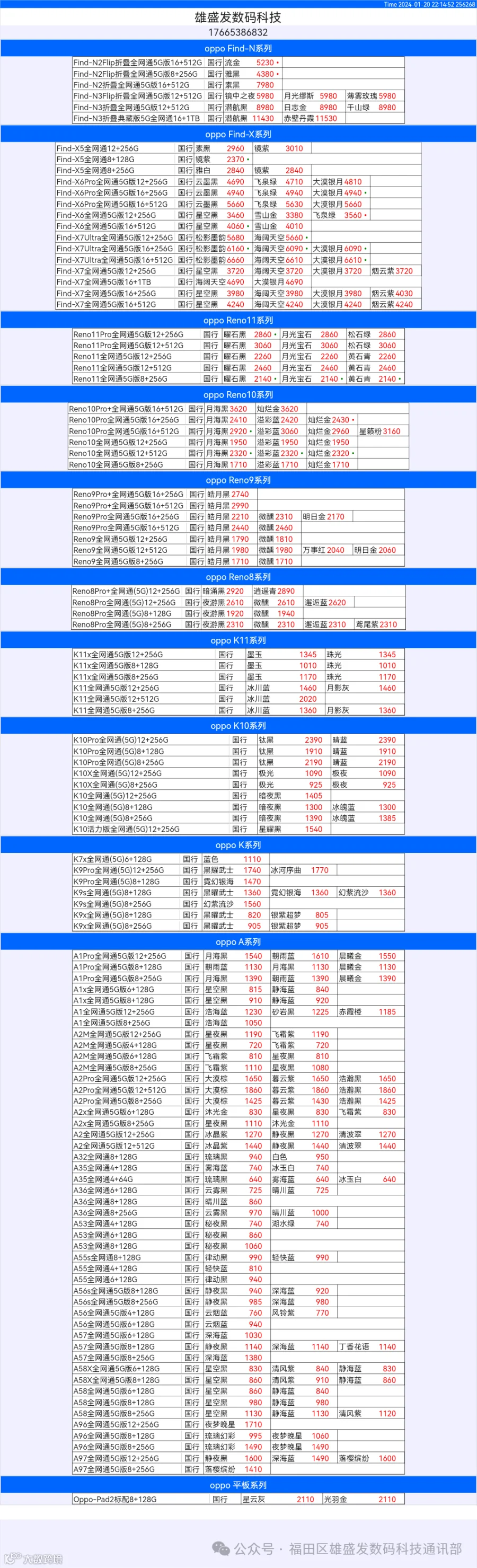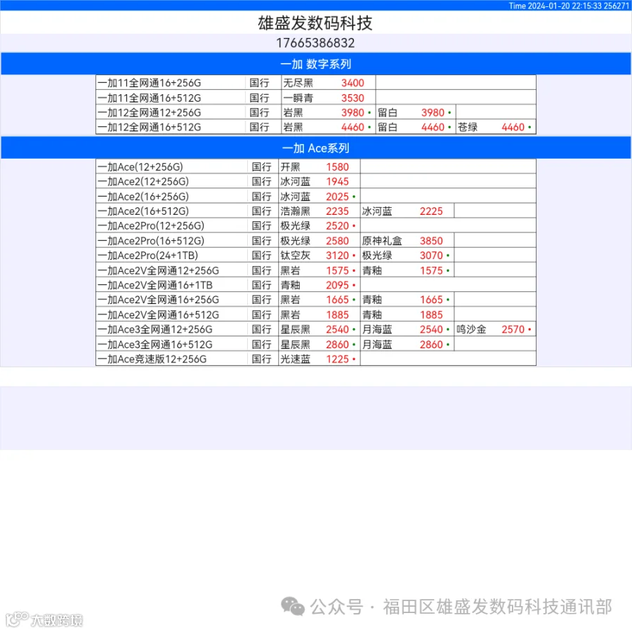 新机报价【2024年1月20日】OPPO   VIVO  IQOO   一加   真我 芯烨微 电子科技