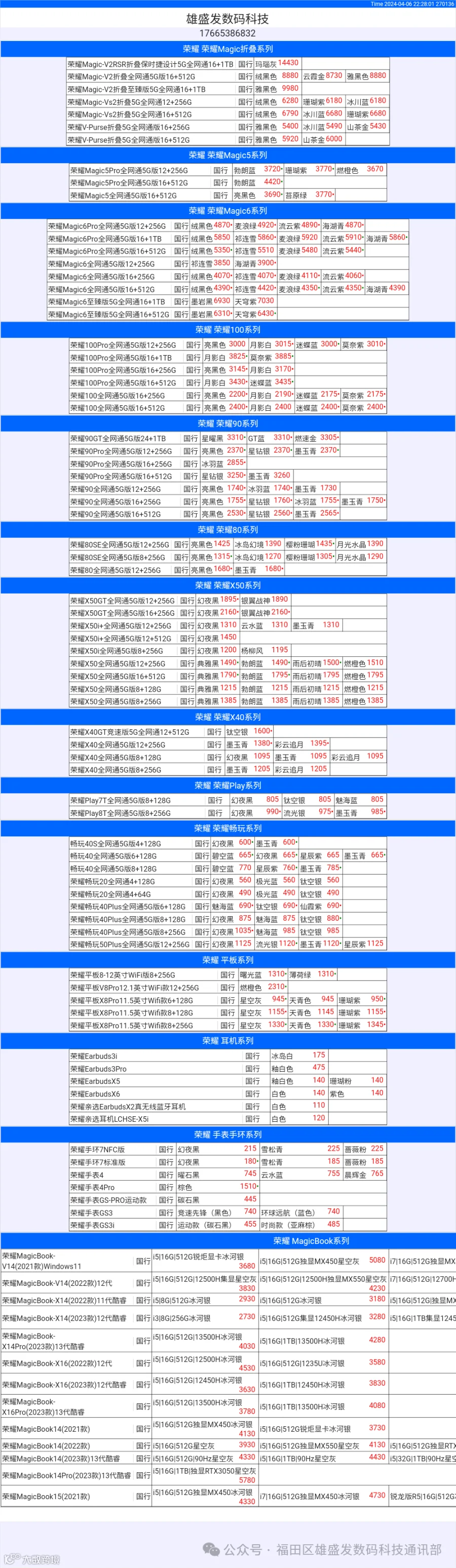 新机报价【2024年4月6日】华为 荣耀 报价