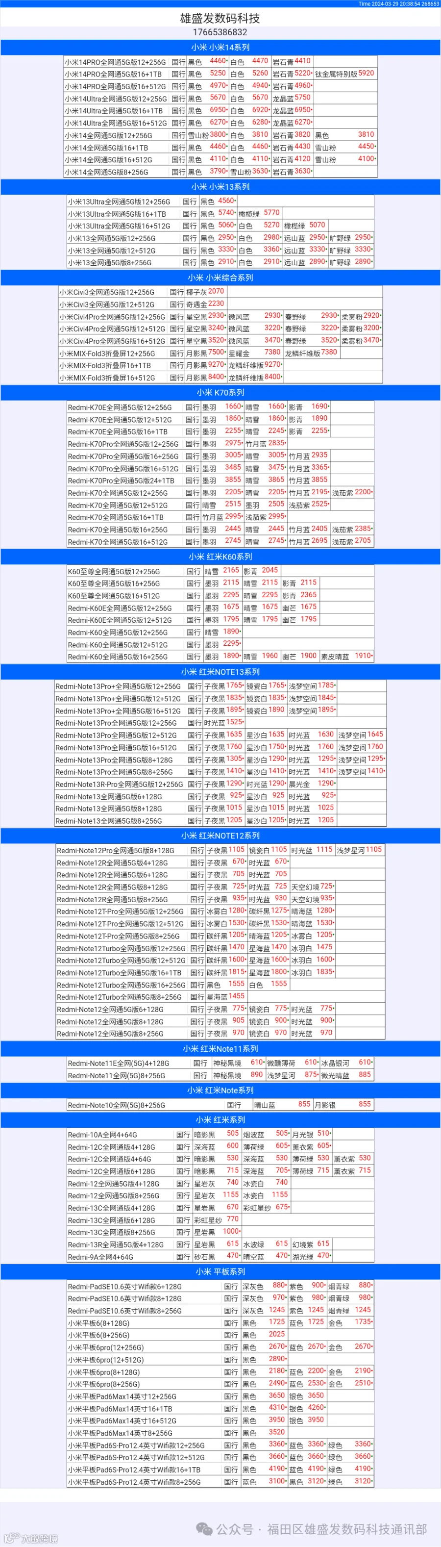 新机报价【2024年3月29日】小米  红米   黑鲨   报价 芯烨微 电子科技