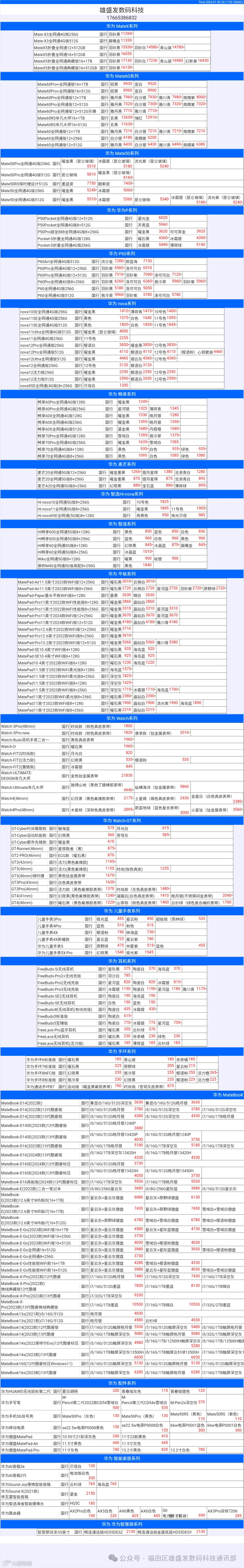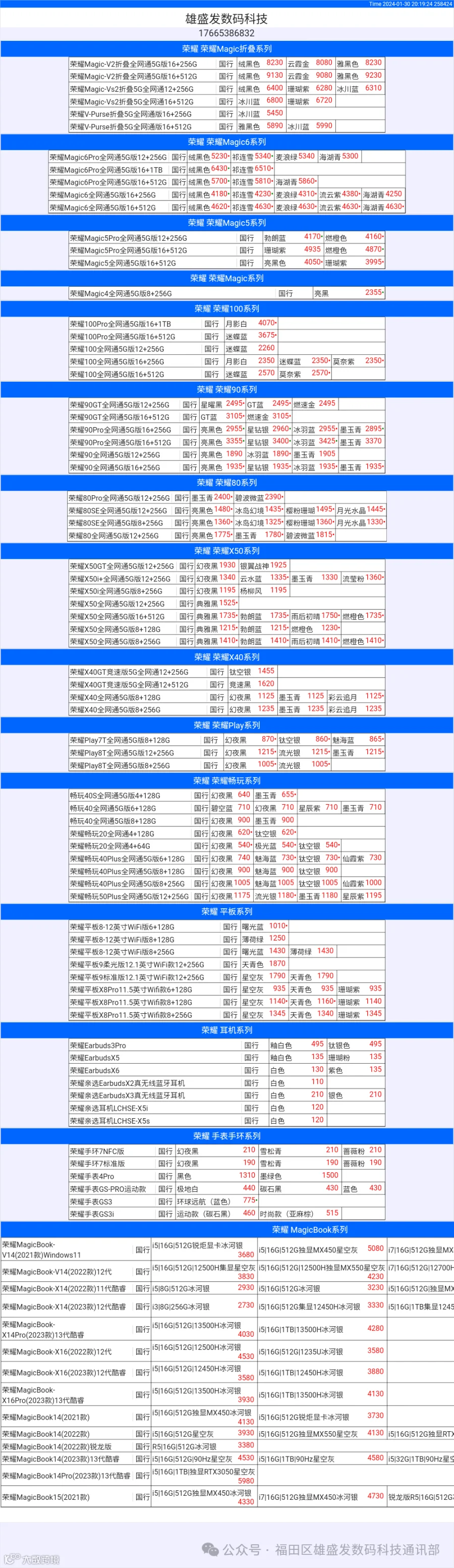 新机报价【2024年1月30日】华为   荣耀 报价 芯烨微 电子科技