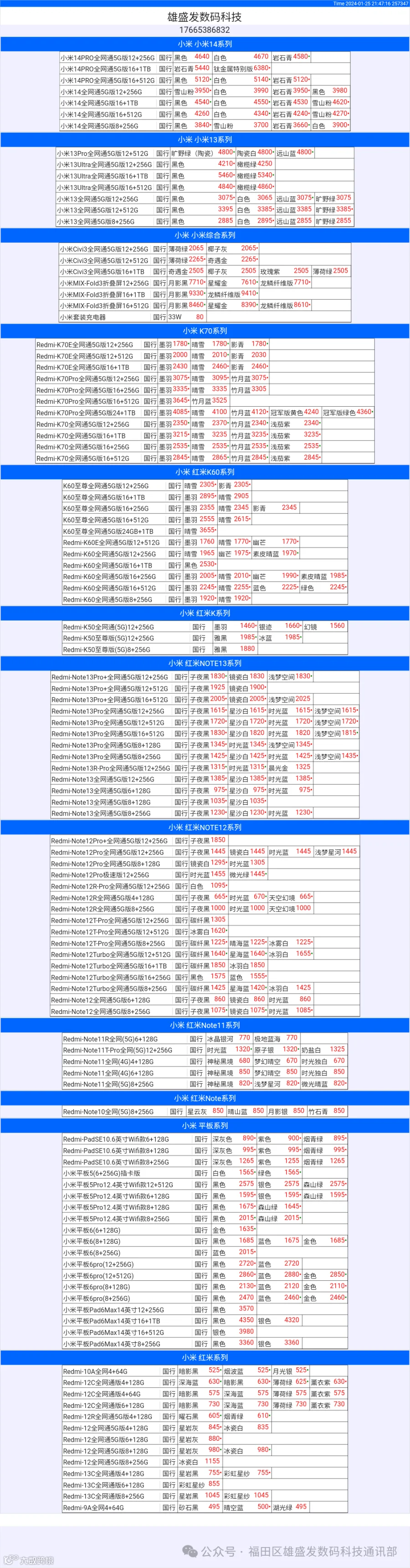 新机报价【2024年1月25日】小米  红米   黑鲨   报价 芯烨微 电子科技