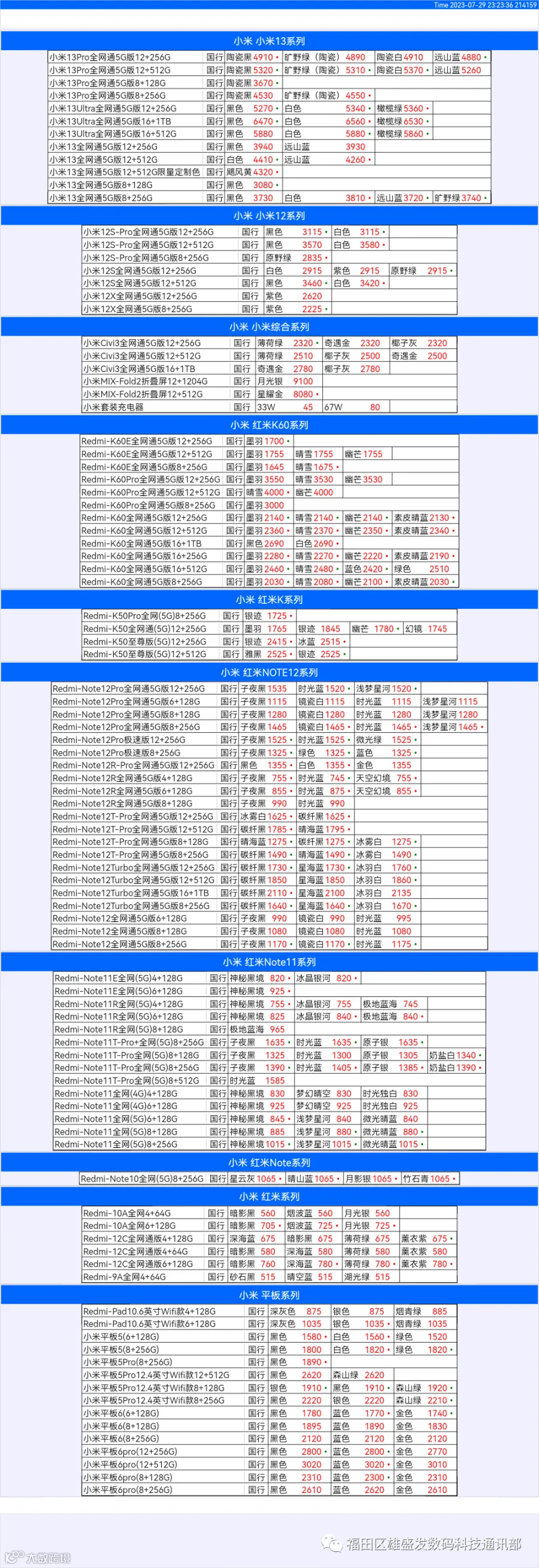 新机报价【2023年7月29日】小米  红米   黑鲨   报价 芯烨微 电子科技