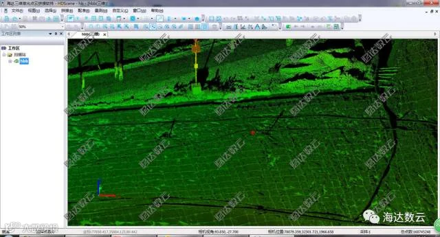 由于HS1200每一次扫描的数据都是使用其自身所设定的扫描仪坐标系统,所以需要利用每一站的后视靶标球来将点云坐标转换为绝对坐标,从而将所有点云均置于统一的地理坐标系下,拼接后的整体点云如图数据成果: