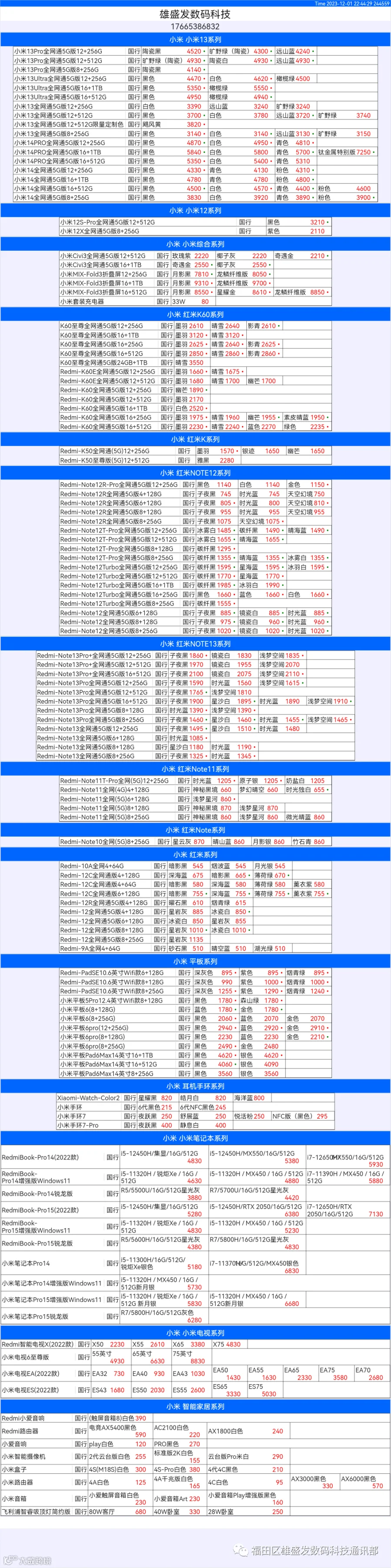 新机报价【2023年12月1日】小米  红米   黑鲨   报价 芯烨微 电子科技