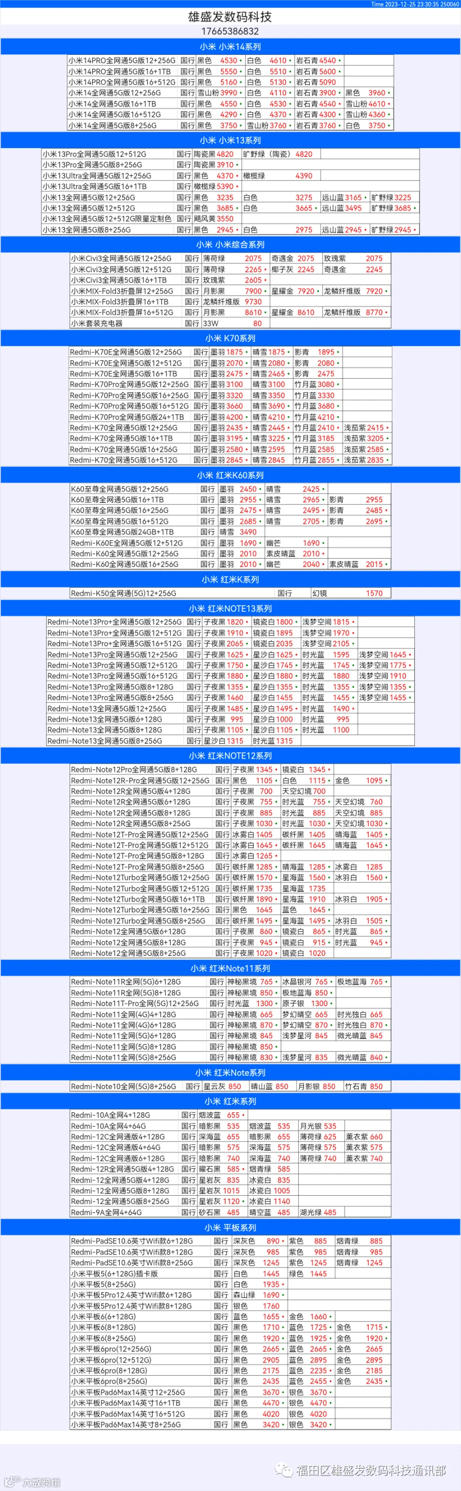 新机报价【2023年12月25日】小米  红米   黑鲨   报价 芯烨微 电子科技