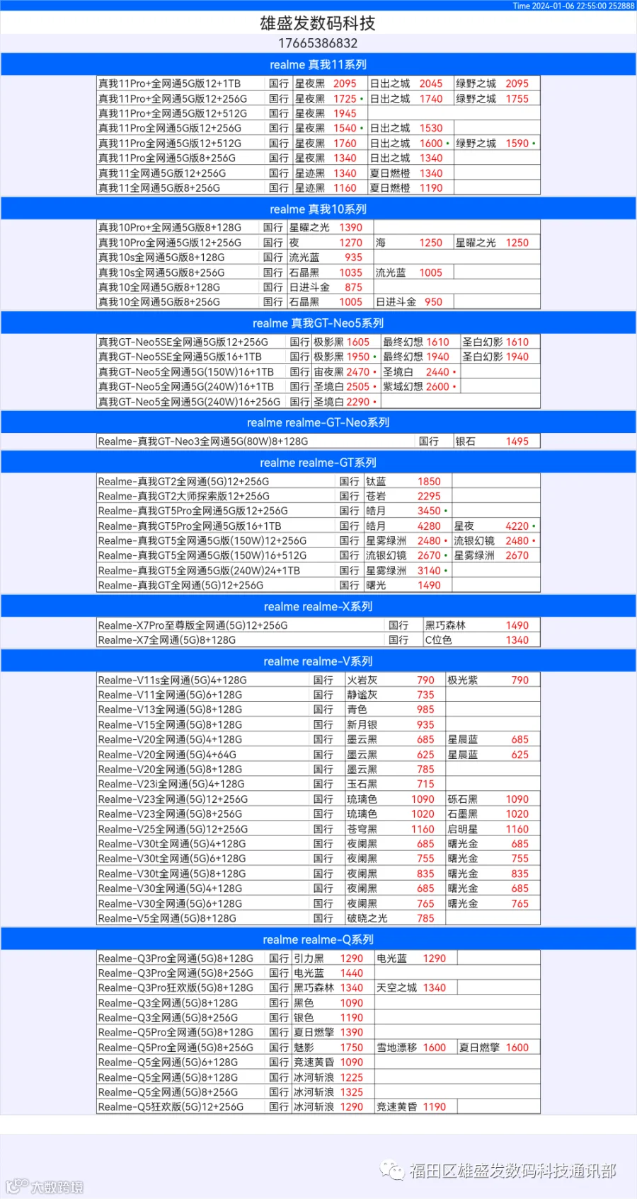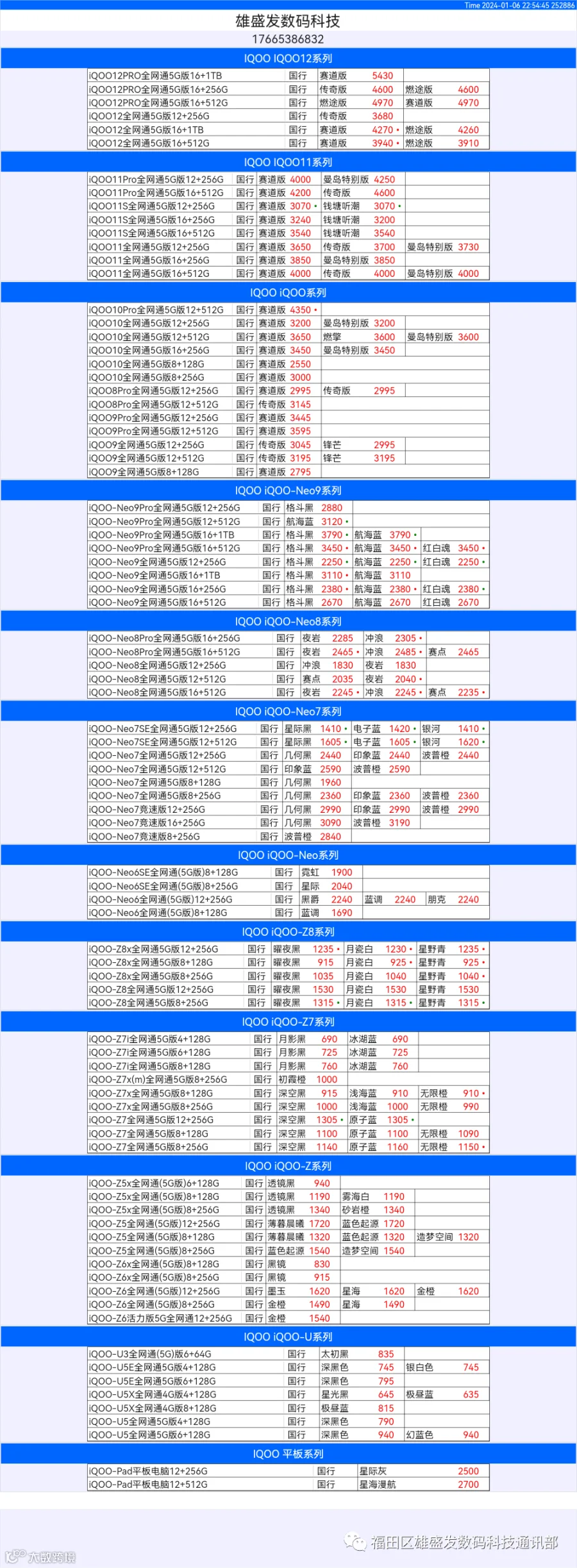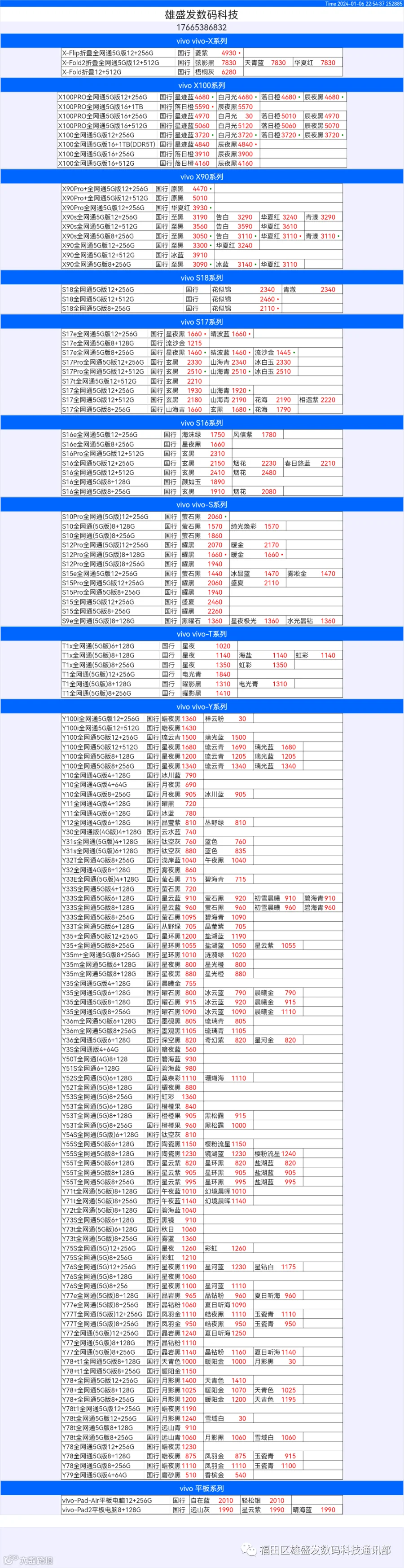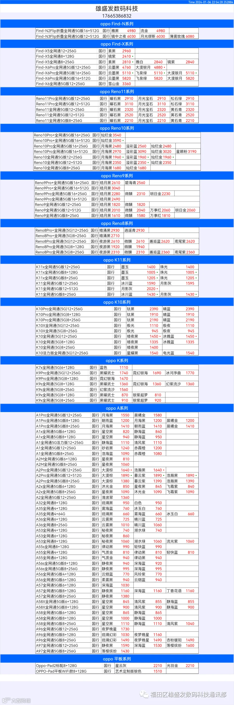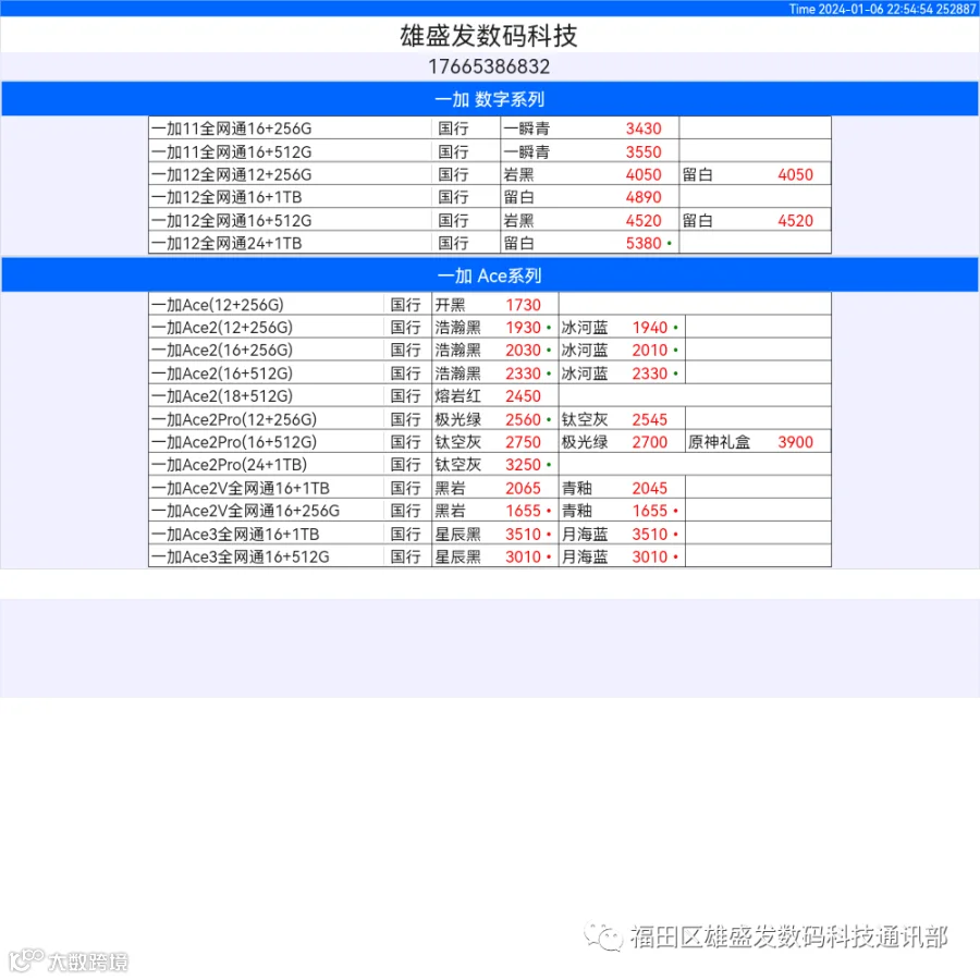 新机报价【2024年1月6日】OPPO   VIVO  IQOO   一加   真我 芯烨微 电子科技