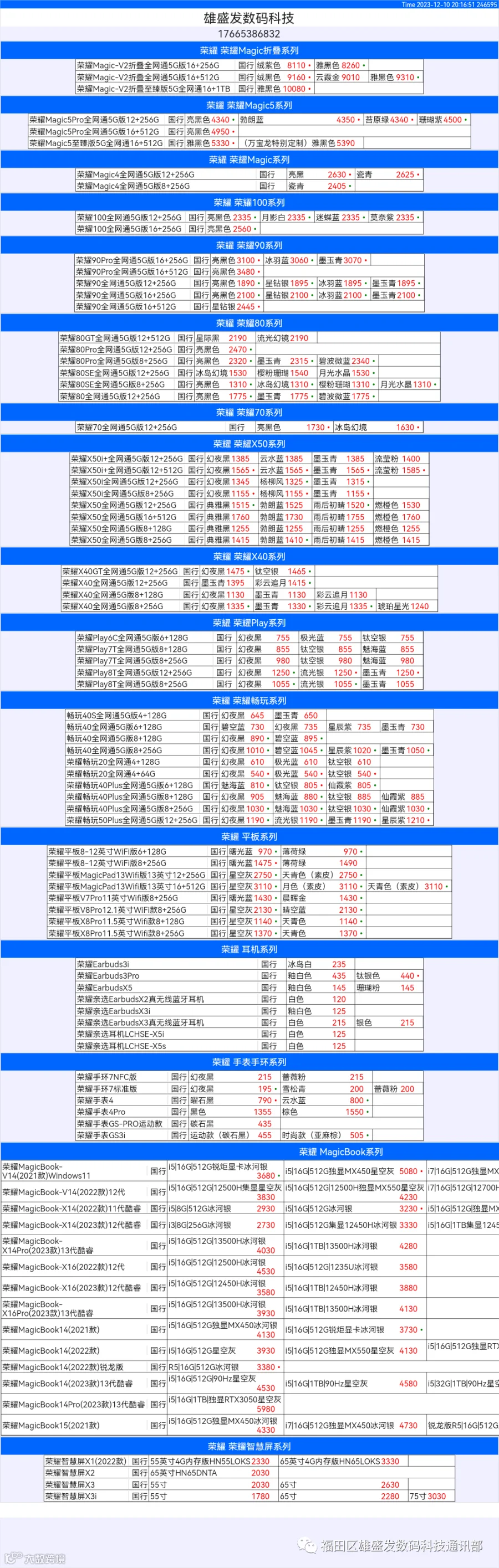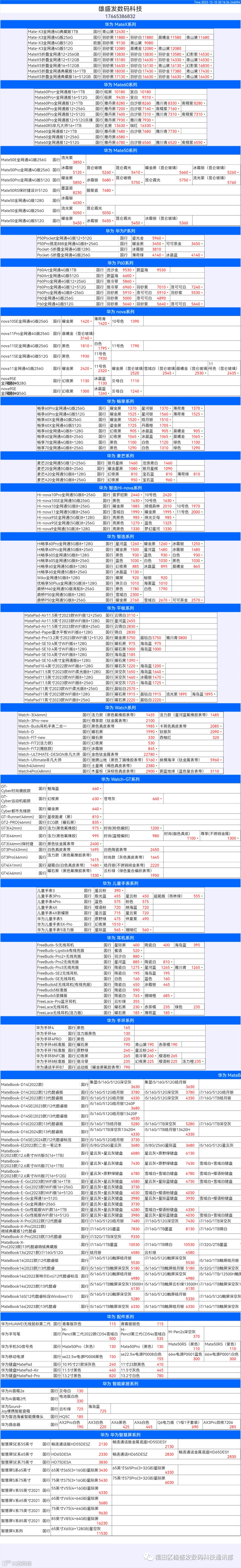 新机报价【2023年12月10日】华为   荣耀 报价 芯烨微 电子科技