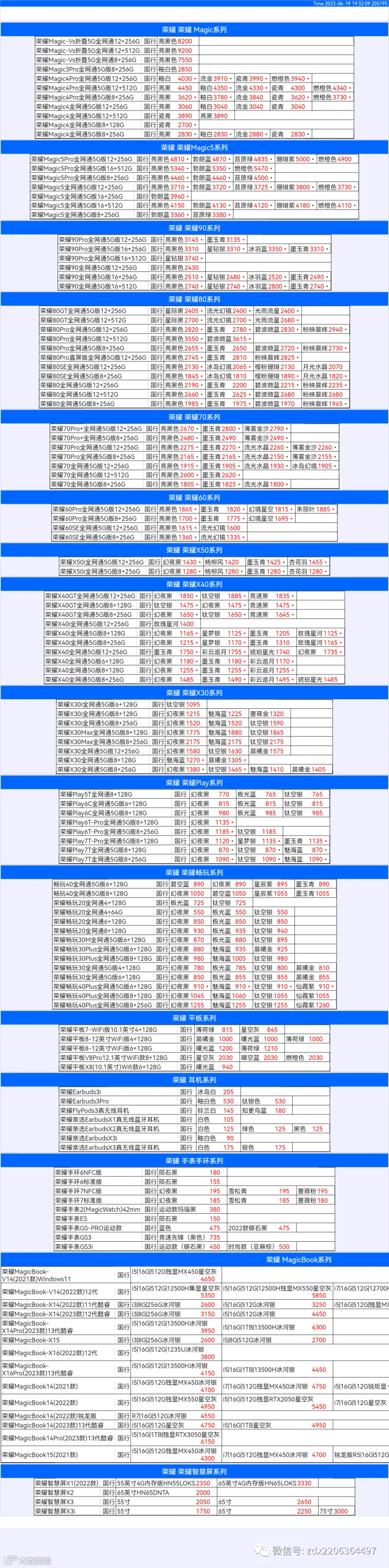 新机报价【2023年6月19日】华为   荣耀 报价 芯烨微 电子科技