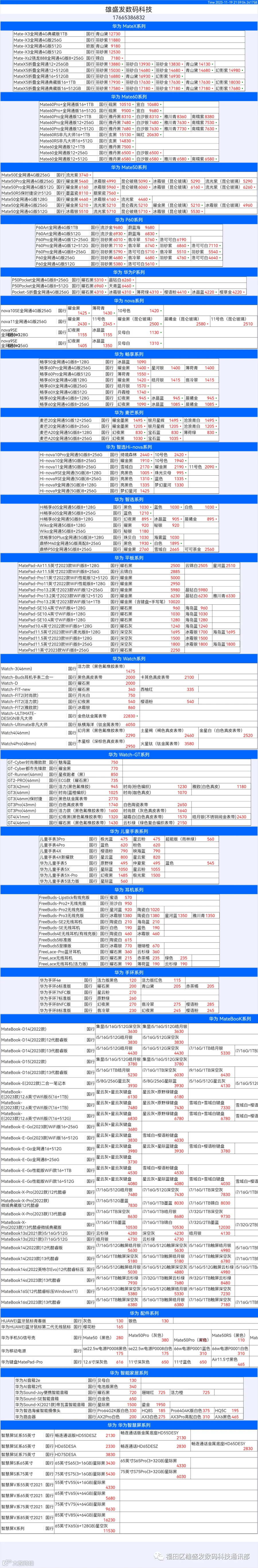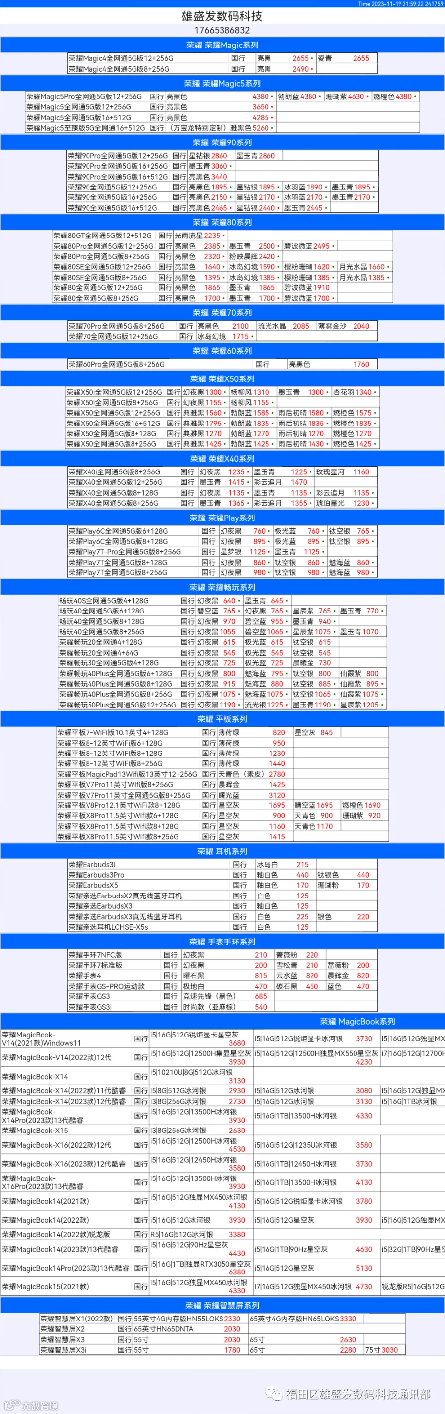 新机报价【2023年11月19日】华为   荣耀 报价 芯烨微 电子科技