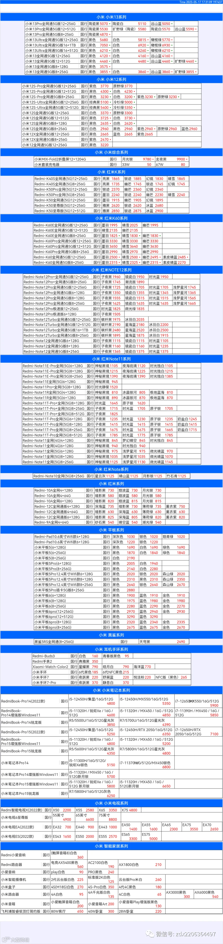 新机报价【2023年5月17日】小米  红米   黑鲨   报价 芯烨微 电子科技