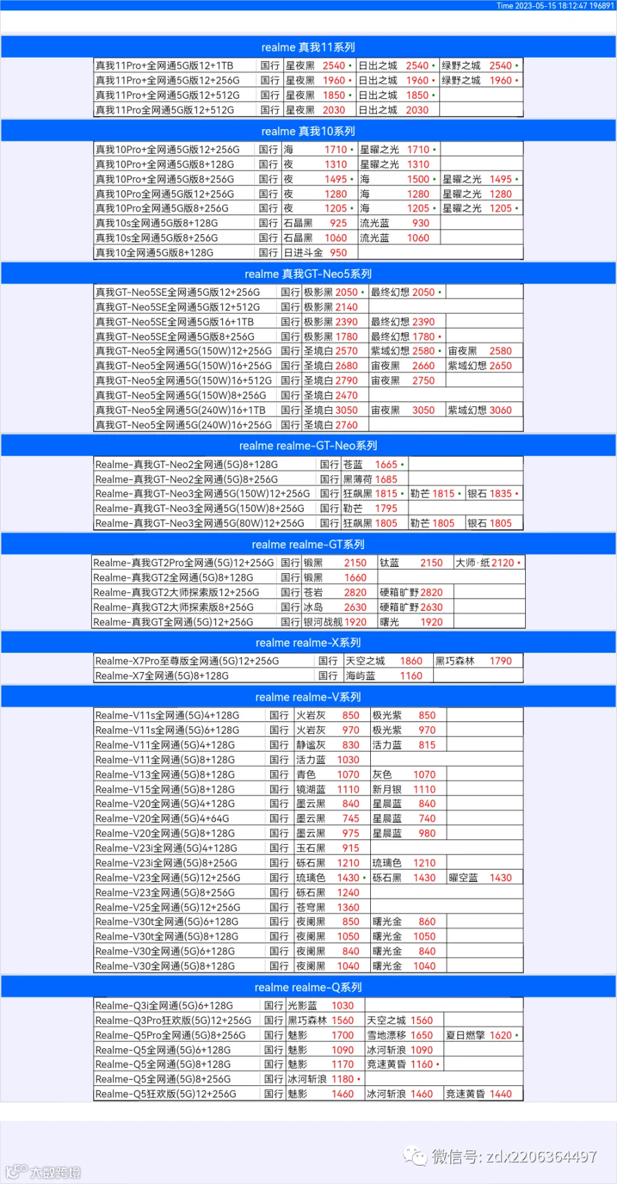 新机报价【2023年5月15日】OPPO VIVO IQOO 一加 真我