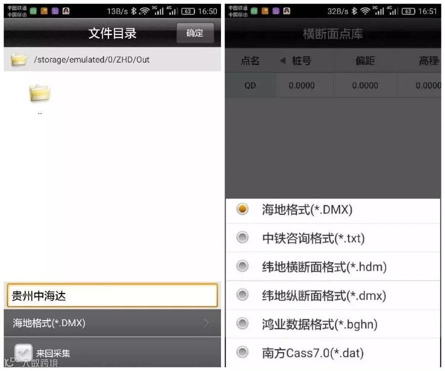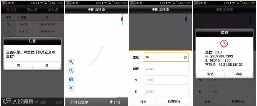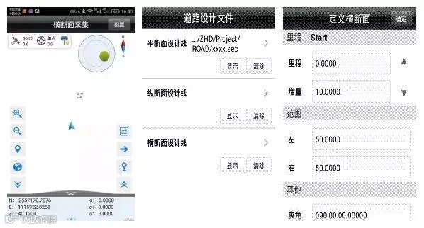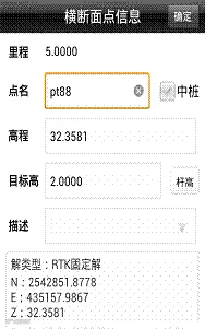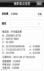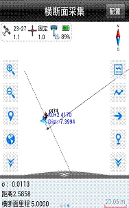 横断面采集时,输入里程,可以唯一定义一个横断面的位置,然后在此断面一定范围内进行采集,处理数据时候能把这些定义为一个横断面的坐标点区别开即可,所以使用软件的时候首先调入道路数据文件(主要是平断面数据),然后输入指定一个里程,软件自动计算该里程处的横断面位置,并在图形上显示一条虚线作为参考线,当靠近此参考线,软件计算当前位置与该参考线的距离,若小于横断面限差设定值,提示可以进行横断面点采集(设定值可以点击配置→数据→横断面限差进行设定)。点击可定义下一个里程的横断面,可设定横断面里程,里程增量,范围以及横断面和线路的夹角。坐标点时,点击坐标点,弹出横断面点信息界面,保存横断面点,若勾选上“中桩点”,该点将作为该横断面的参考点,横断面点库将保存该横断面上的其它点相对于中桩点的平距高程,注:每个断面必须定义一次断面里程,且采集中桩点,否则该断面采集的断面点将无效,或者事后手动添加中桩点。