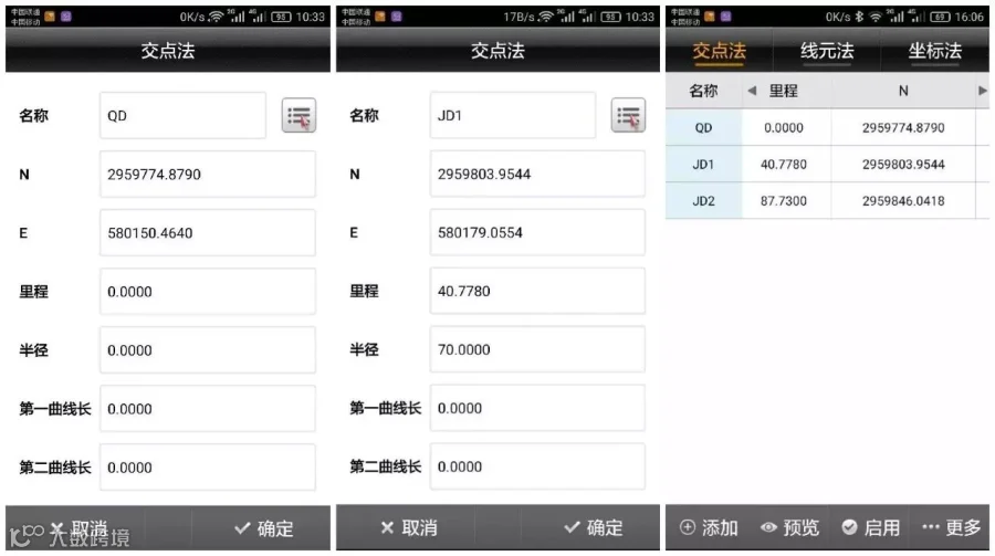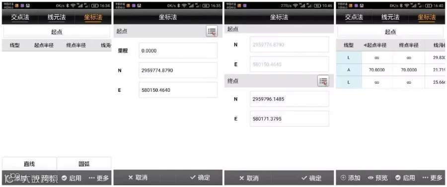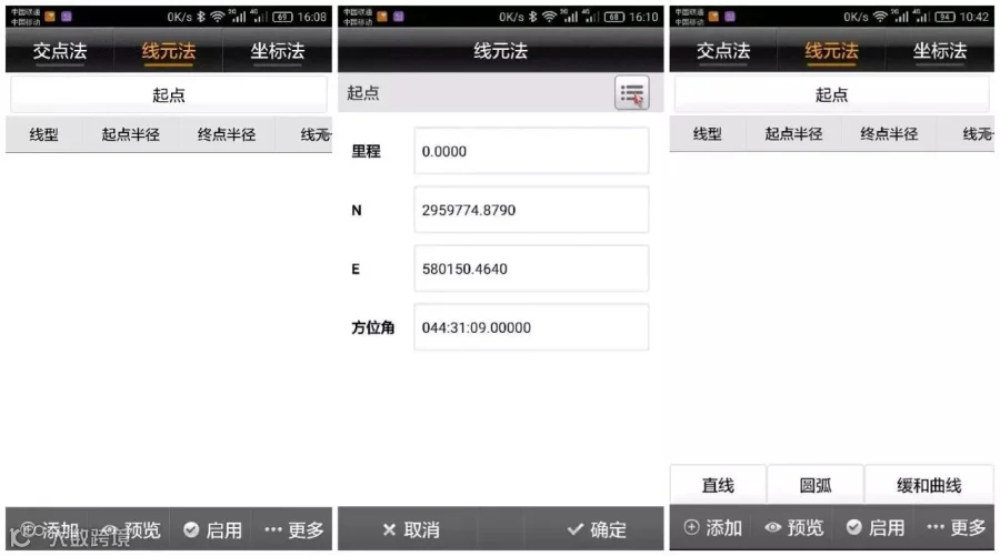 在一般工作过程中,只需要输入起点坐标、里程、方位角,点击添加线元数据,选择线型,输入线元要素。