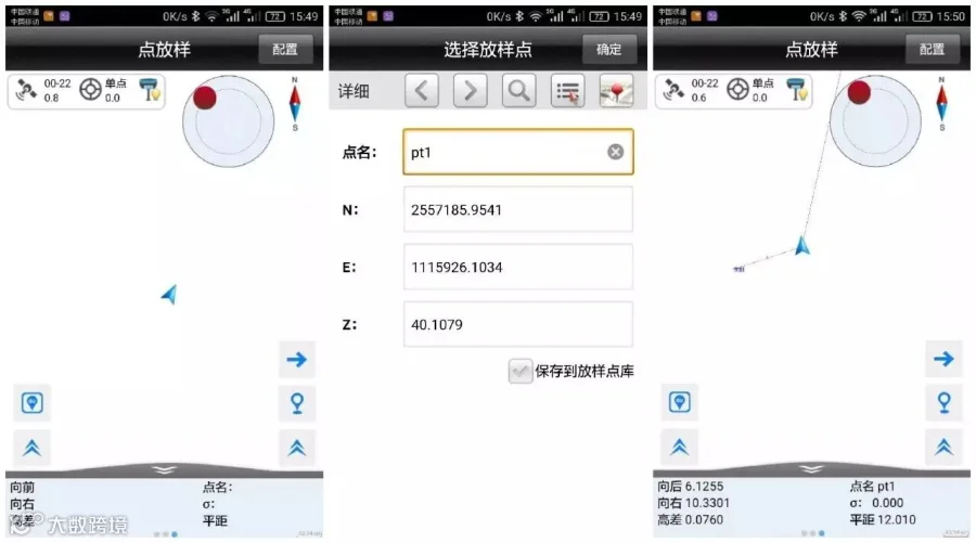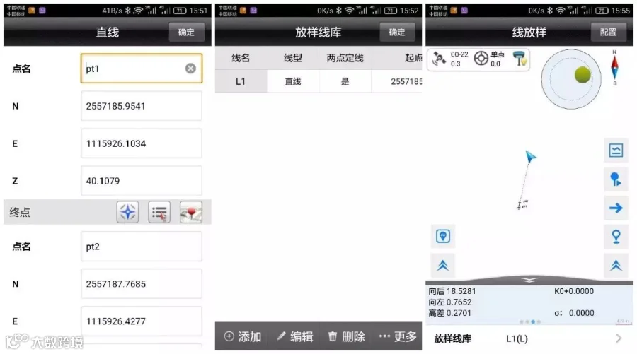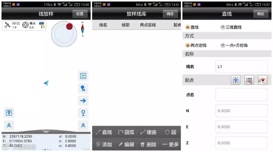 在线放样界面,先点击文稿图标定义并选择放样线,再点向右箭头输入坐标,然后根据方向和距离提示找到放样点。