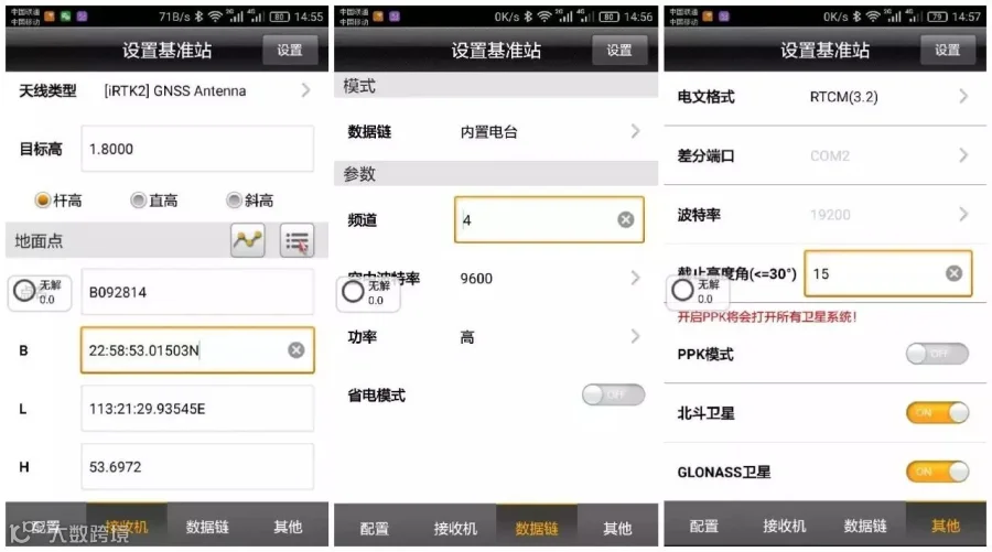 设置基准站—位置--平滑(让基准站获取自己的坐标,以此坐标作为起算点向移动台发射差分数据。)输好点名和天线高(斜高),再设置数据链和其他。(数据链的各项参数和其他里面的差分电文格式基准站和移动台务必要设成一致,移动台才能收到基准站的信号,差分电文格式3.2为三星通用,3.0为双星通用。