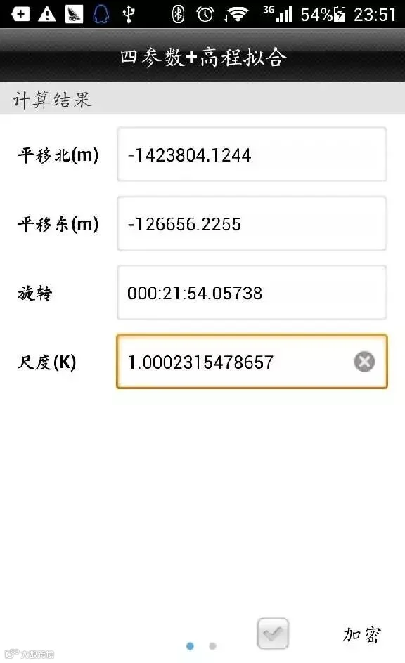 添加完两个以上的点对后,点计算,显示计算出来的四参数+高程拟合的结果,主要看旋转和尺度,旋转角度不超过1分,尺度大于0.999小于1.0009会比较好。(一般来说,尺度越接近1越好)。