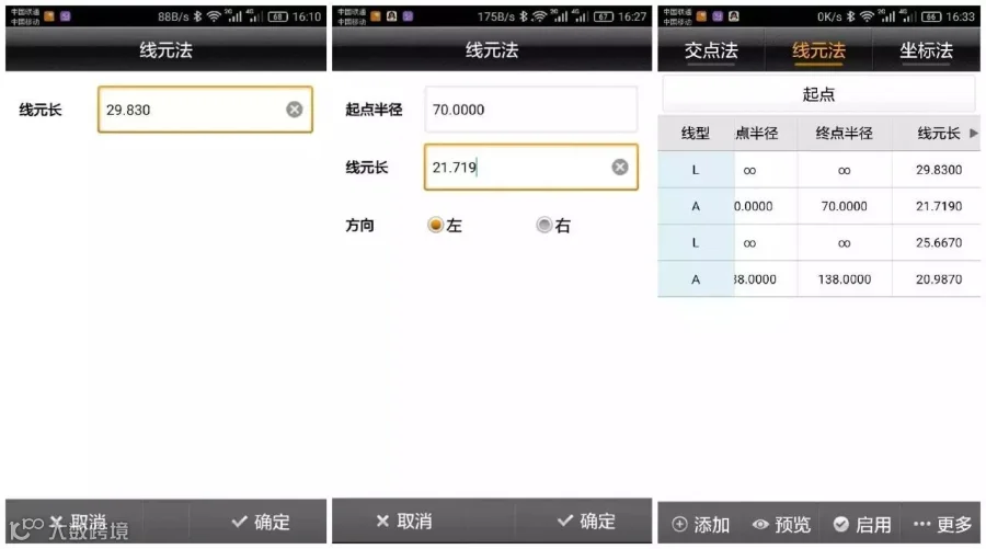 “圆弧”:输入起点半径(∞代表无限大即直线)、线元长、方向(前进方向为参考的偏转方向)。