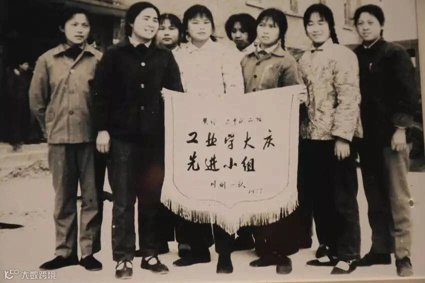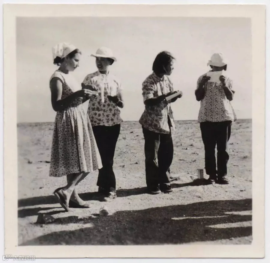 测绘队伍有一批女测绘队员 ,她们巾帼不让须眉,活跃在外业一线,为祖国的测绘事业作出了突出贡献。图一为1957年下半年,国测第七地形测量队女队员在内蒙古鄂尔多斯测区开展航测外业工作,苏联专家实地指导女子测量组进行野外像片判读,左一是俄语翻译。 图二为1977年川测一院女子中队获得工业学大庆先进小组称号并获赠锦旗,小组成员手持锦旗合影。