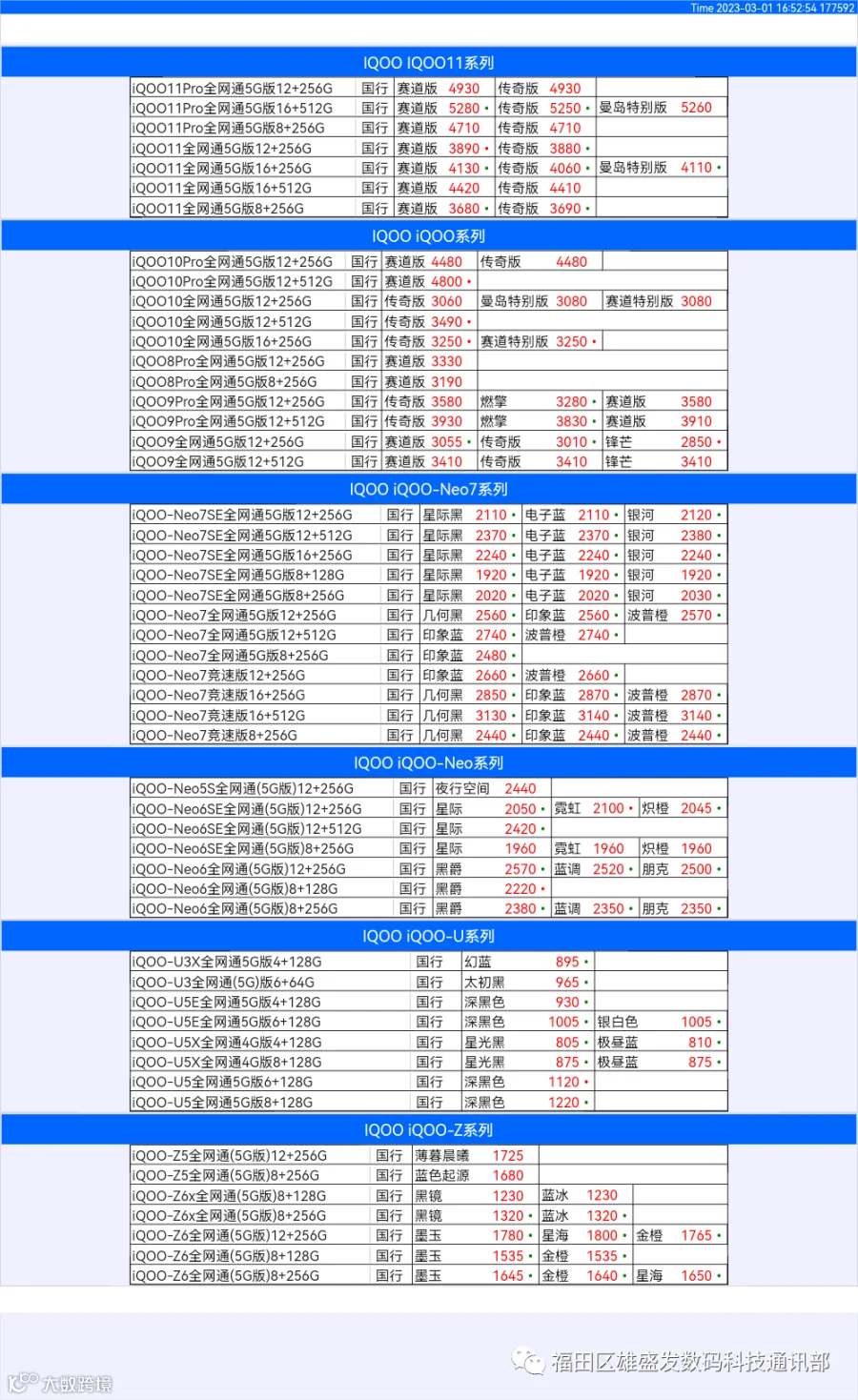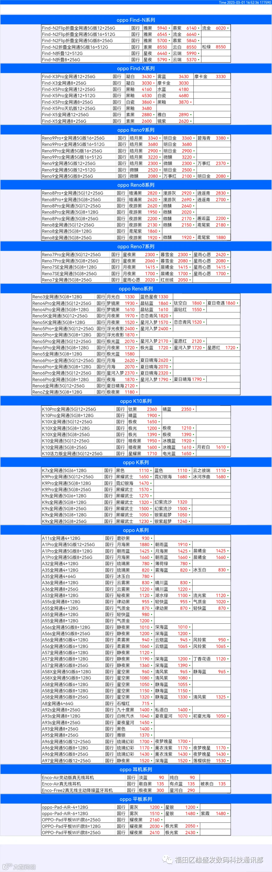 新机报价【2023年3月1日】OPPO   VIVO  IQOO   一加   真我 芯烨微 电子科技