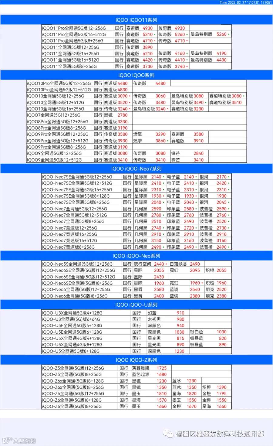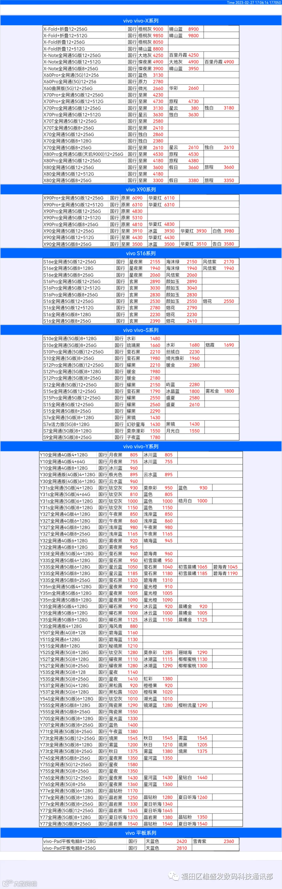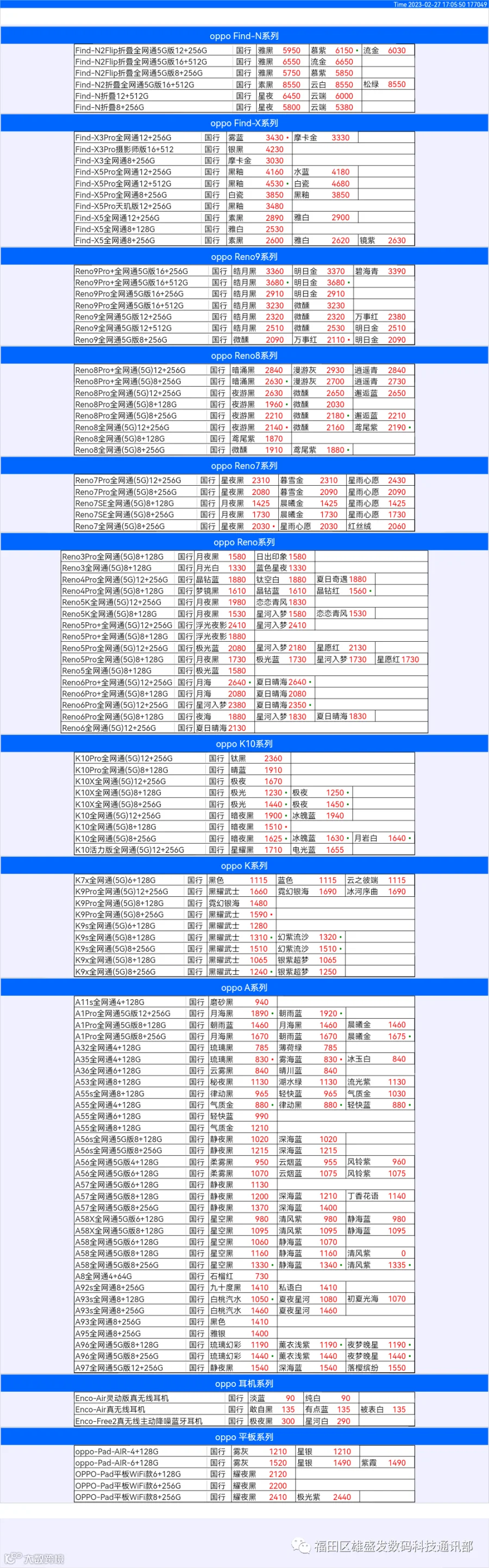 新机报价【2023年2月27日】OPPO   VIVO  IQOO   一加   真我 芯烨微 电子科技